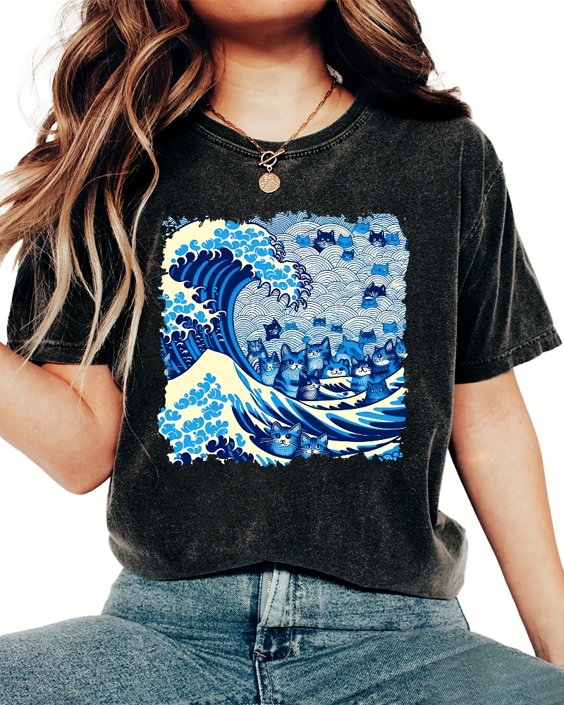 Kanagawa cat Front And Back Printing Washed T-shirt