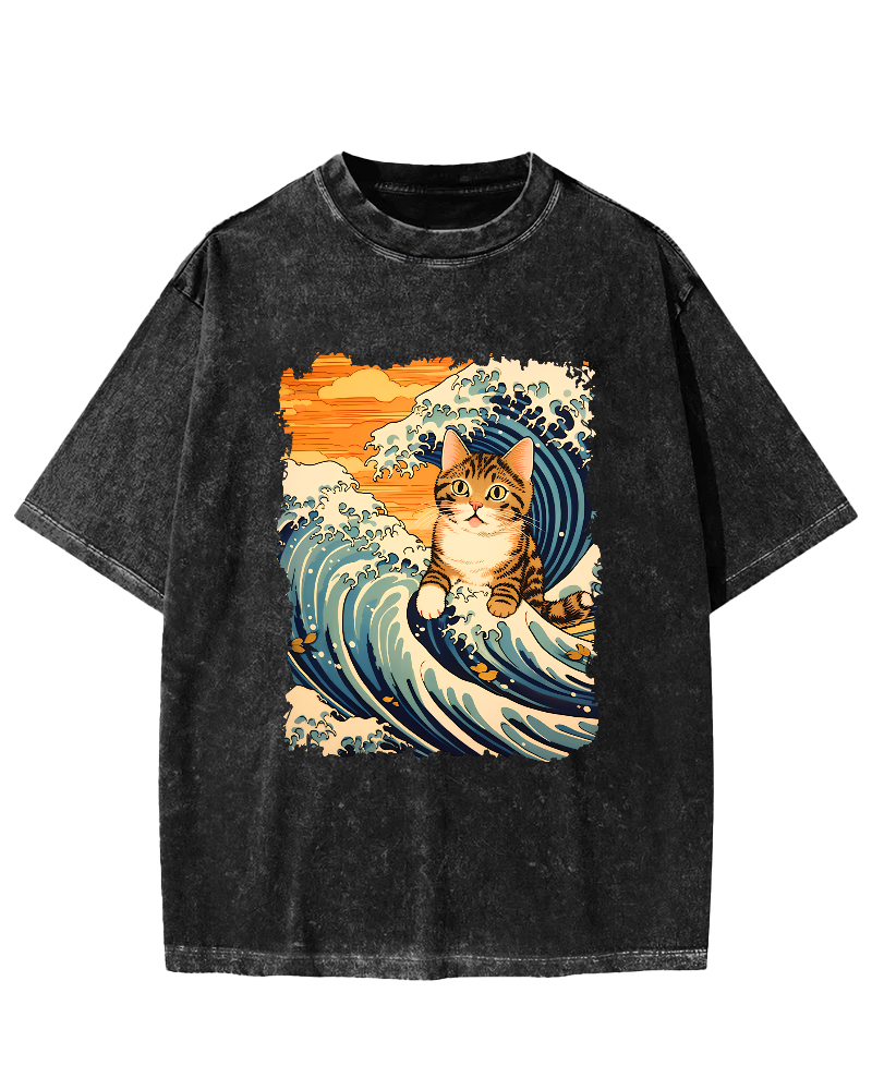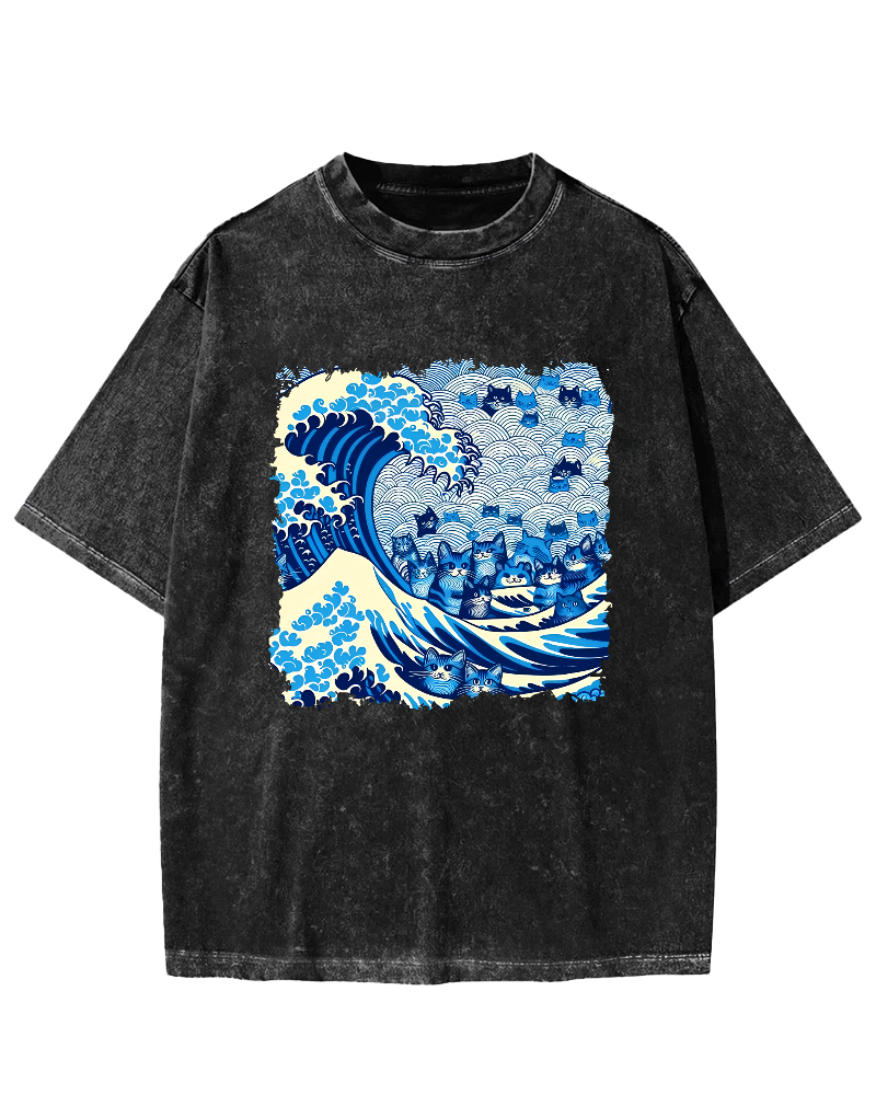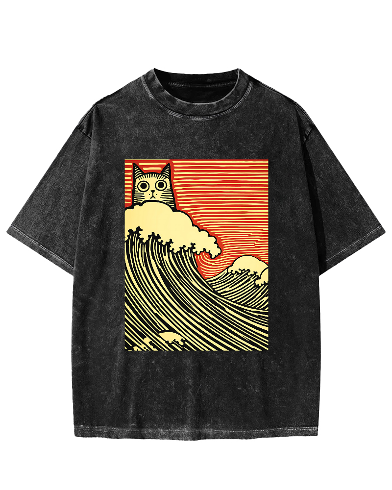 Wave Japanese Cat Art Vintage Washed T-shirt