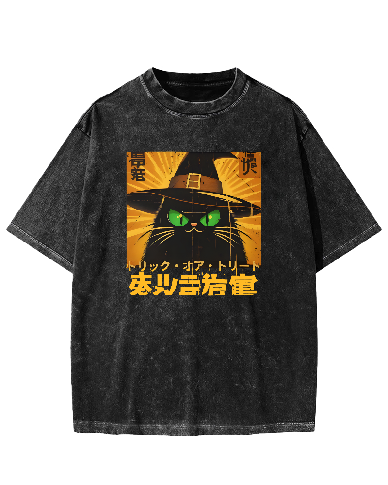 Retro Japanese Witch Cat Vintage Washed T-shirt