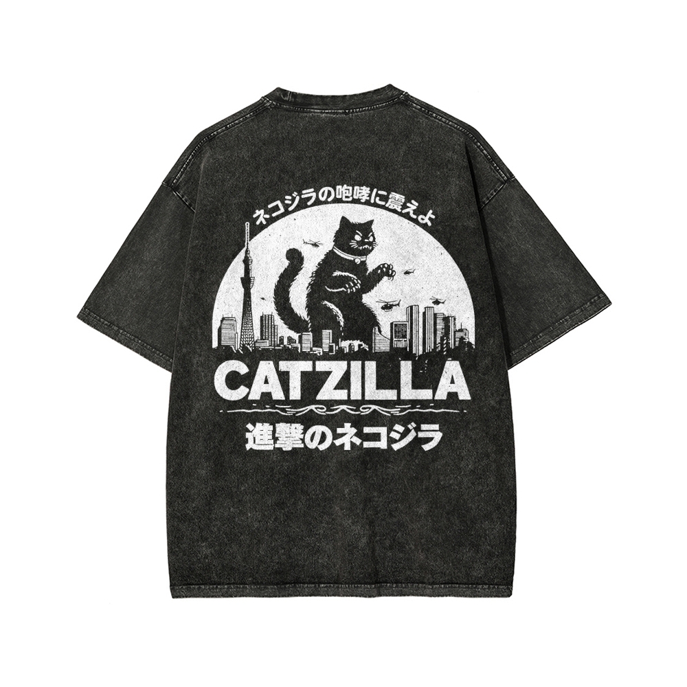 Cat retro Japanese Front And Back Printing Washed T-shirt