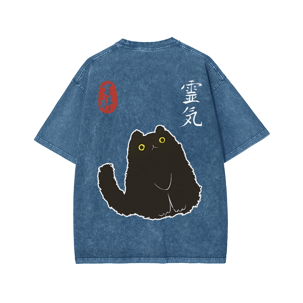 Lucky Cat Black Cat Vintage Wash Japanese Design Front And Back Printing Washed T-shirt