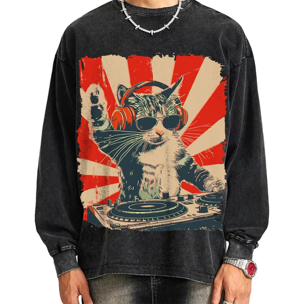 Cool Cat DJ Poster Showa Retro Vintage Washed Sweatshirts