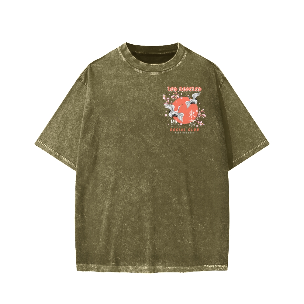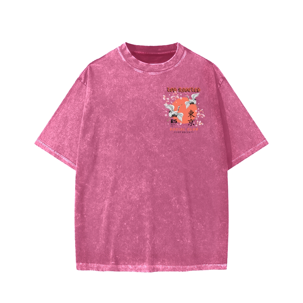 Tokyo Cherry Blossoms And Red-Crowned Cranes Front And Back Printing Washed T-shirt