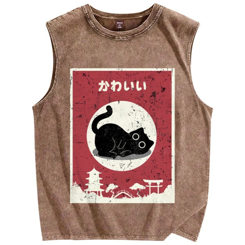 Kawaii Cute Cat Vintage Distressed Washed Tank Top