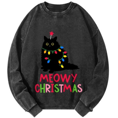 Meowy Christmas Funny Black Cat Vintage Washed Sweatshirts