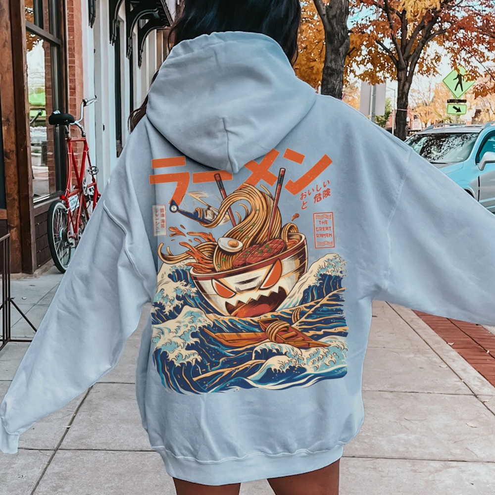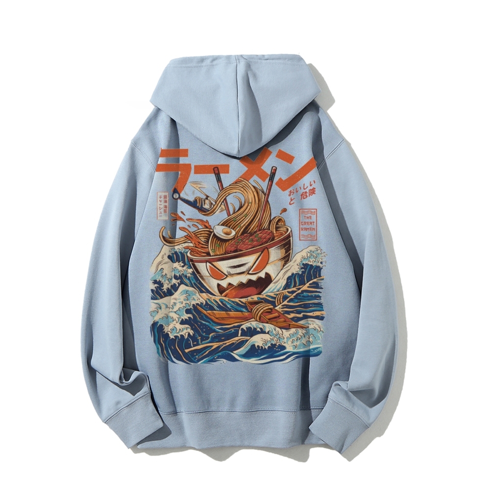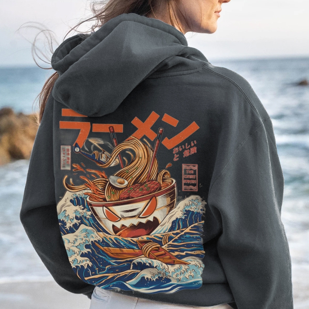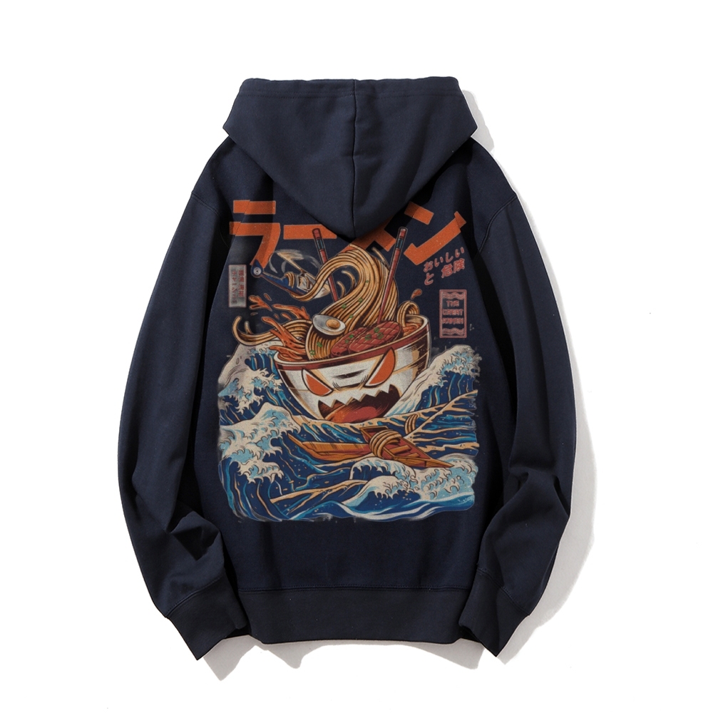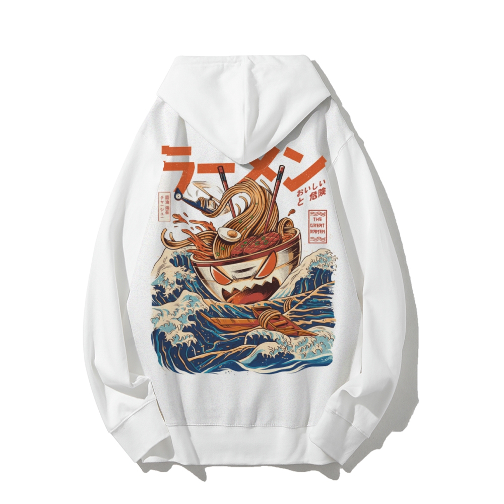Ramen Monster at the Great Wave off Kanagawa Printed Back Cotton Hoodie