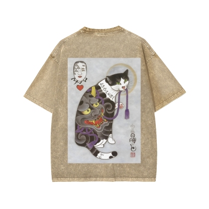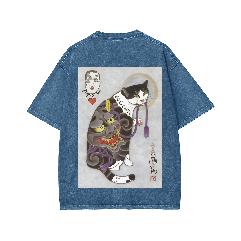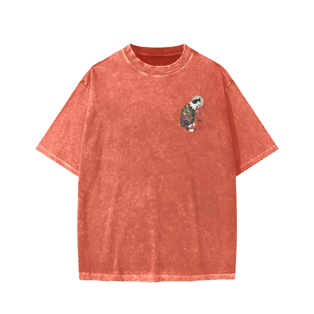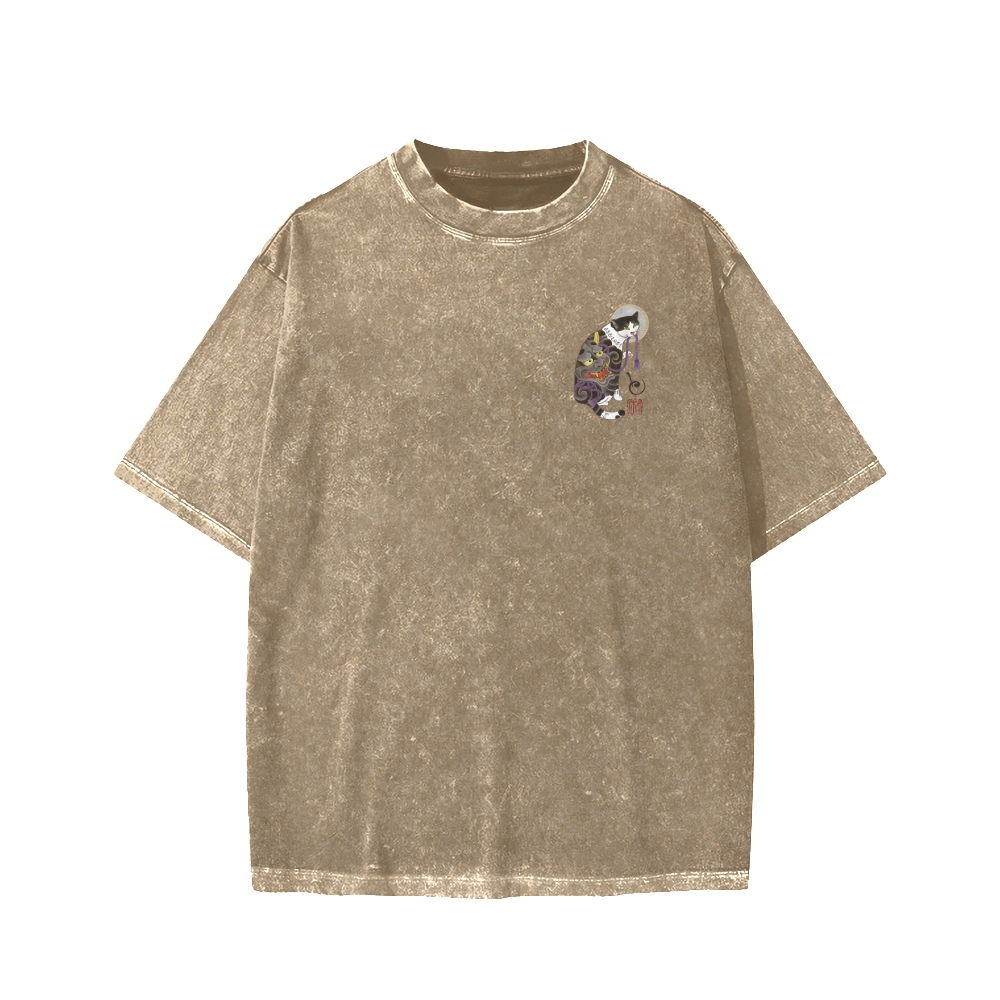 Ukiyo Cat Irezumi Tattoo Cat Front And Back Printing Washed T-shirt
