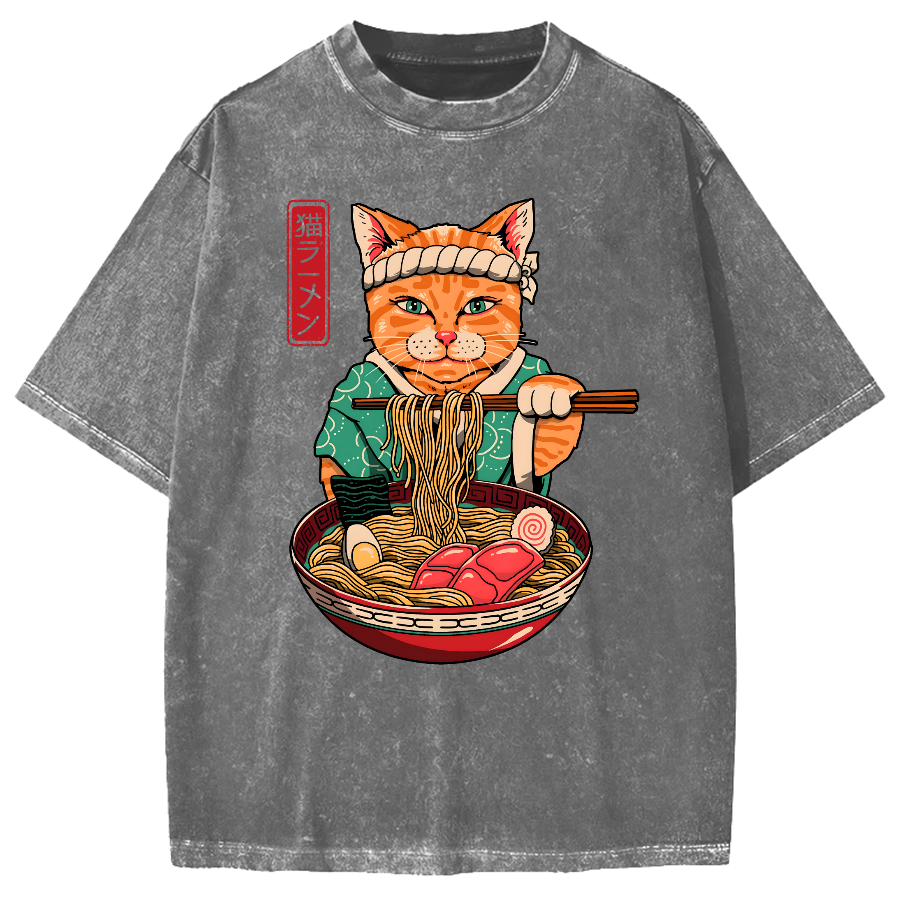 Cat Eating Ramen Japanese Ukiyoe Vintage Washed T-shirt