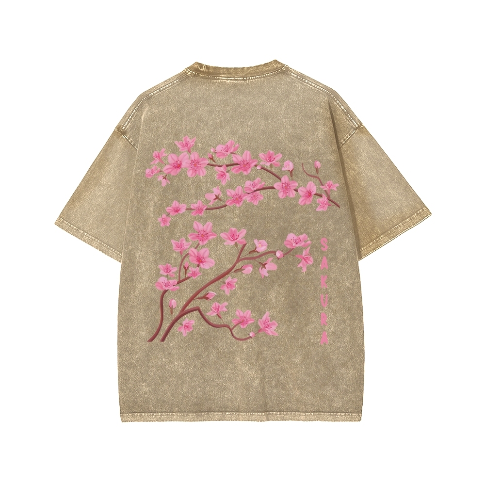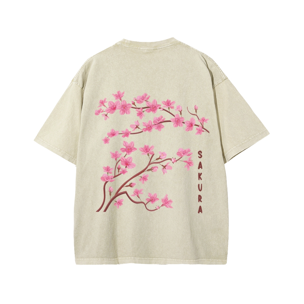 Japanese Sakura Dragon Front And Back Printing Washed T-shirt