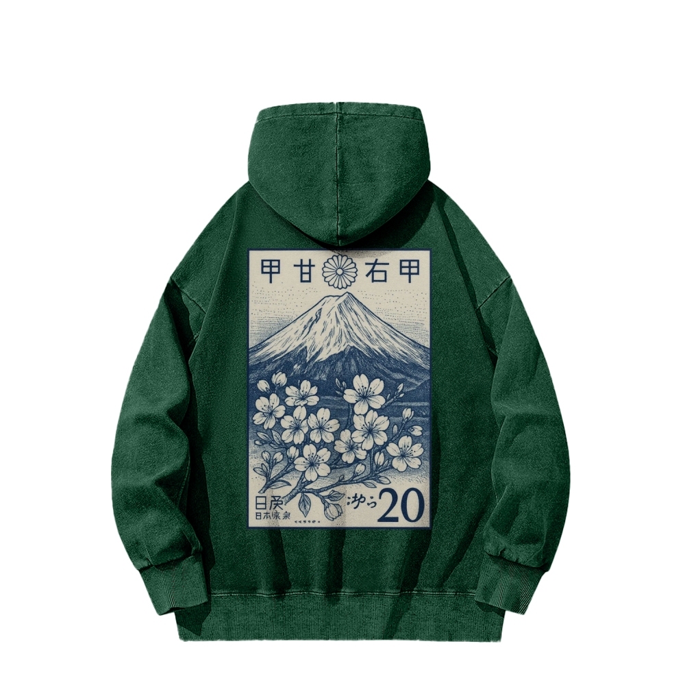Japan Sakura Post Stamp Front And Back Printing Vintage Washed Hoodie