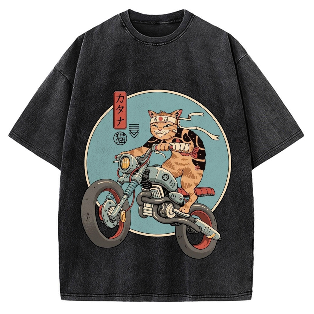 Japanese Cat riding a motorcycle Vintage Washed T-shirt