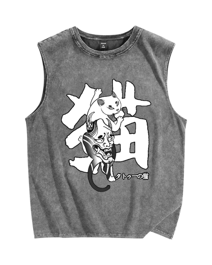 Cat With Oni Mask Tattoo Vintage Distressed Washed Tank Top