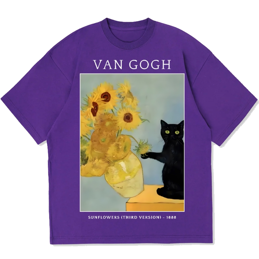 Black Cat And Sunflower Van Gogh Cat Cotton casual T-shirt