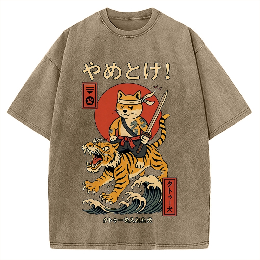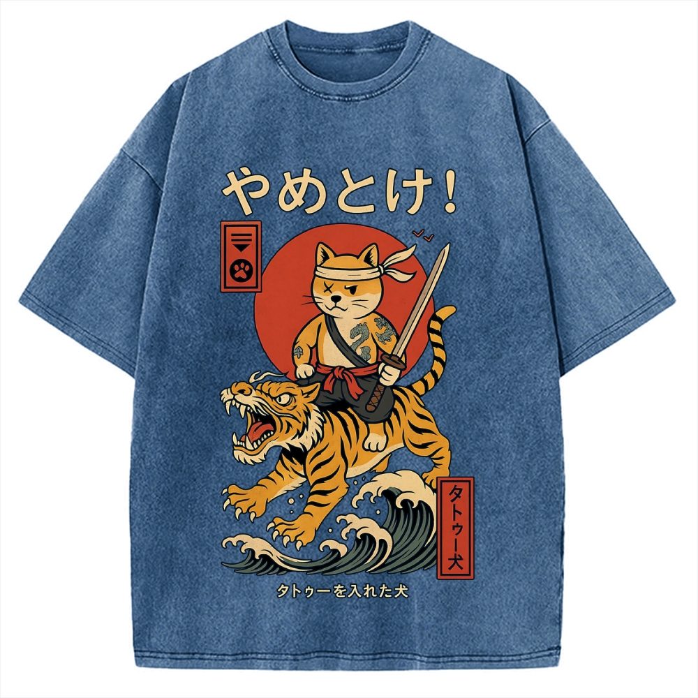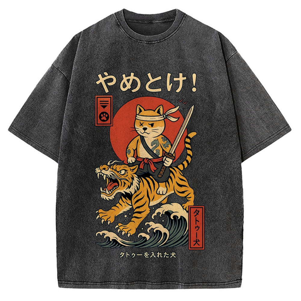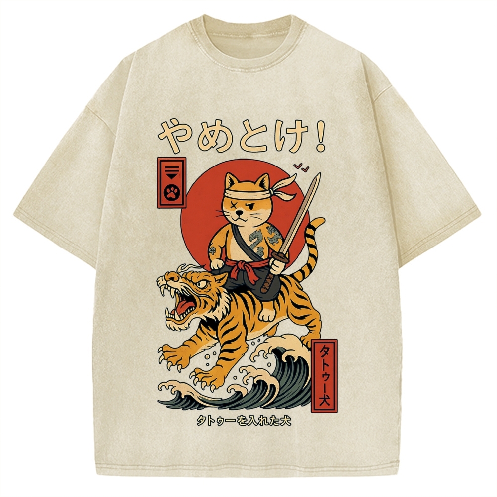 Cat Riding Tiger Japanese Style Wave Vintage Washed T-shirt