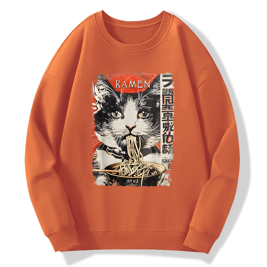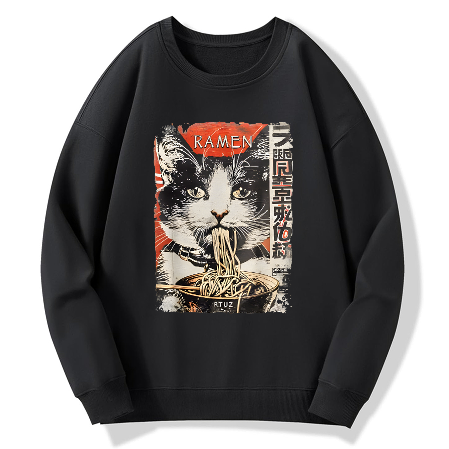 A retro cat eating Lamian Noodles Cotton Pullover Sweatshirt