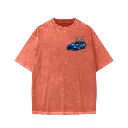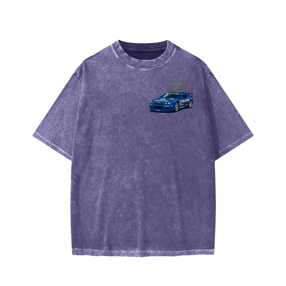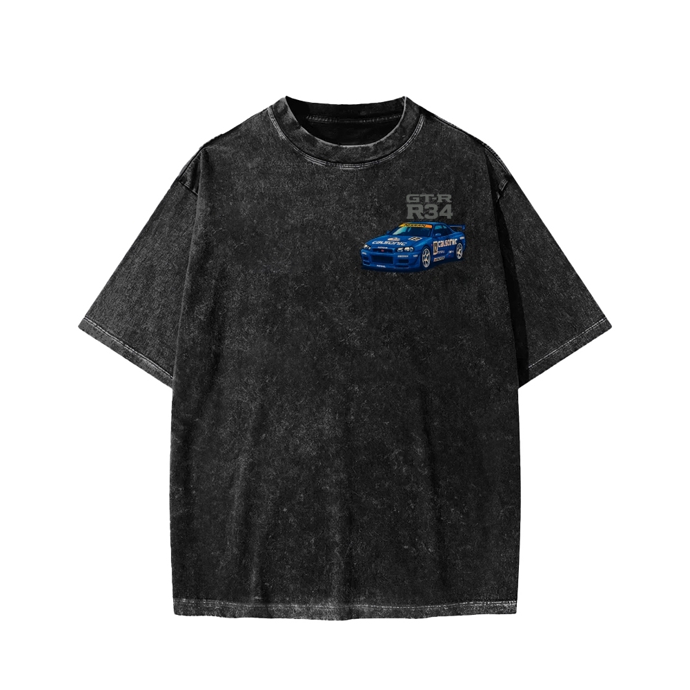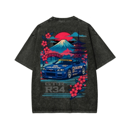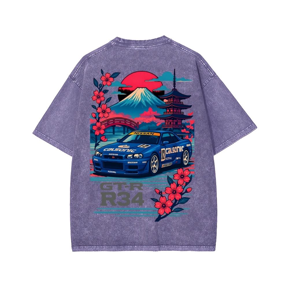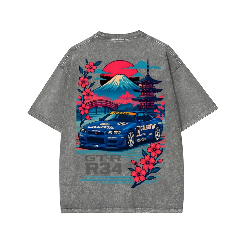 Calsonic Nissan Skyline R34 GTR with Mount Fuji and Sakura Front And Back Printing Washed T-shirt