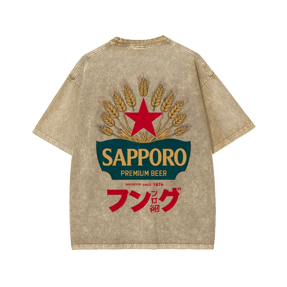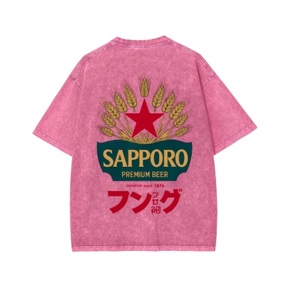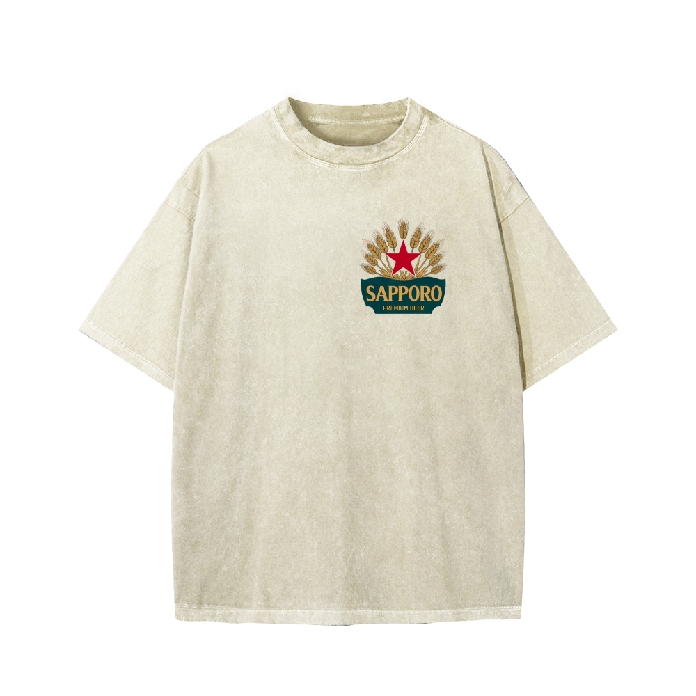Classic Japanese Beer Front And Back Printing Washed T-shirt
