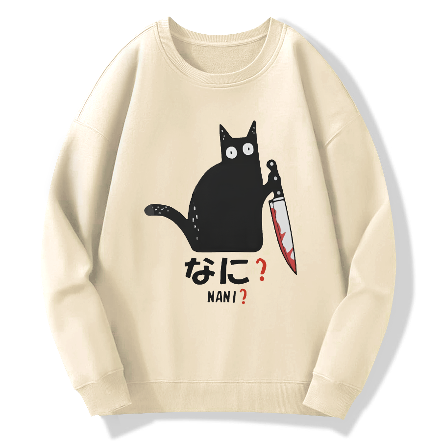 Confused cat holding a knife Cotton Pullover Sweatshirt