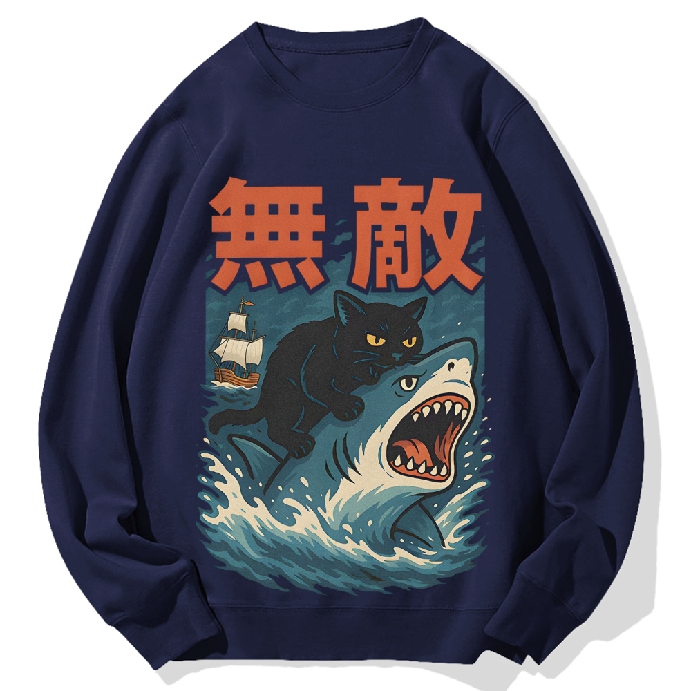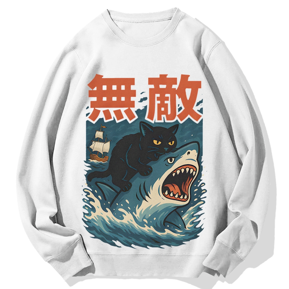 Funny Cat riding a shark Invincible Cotton Sweatshirt