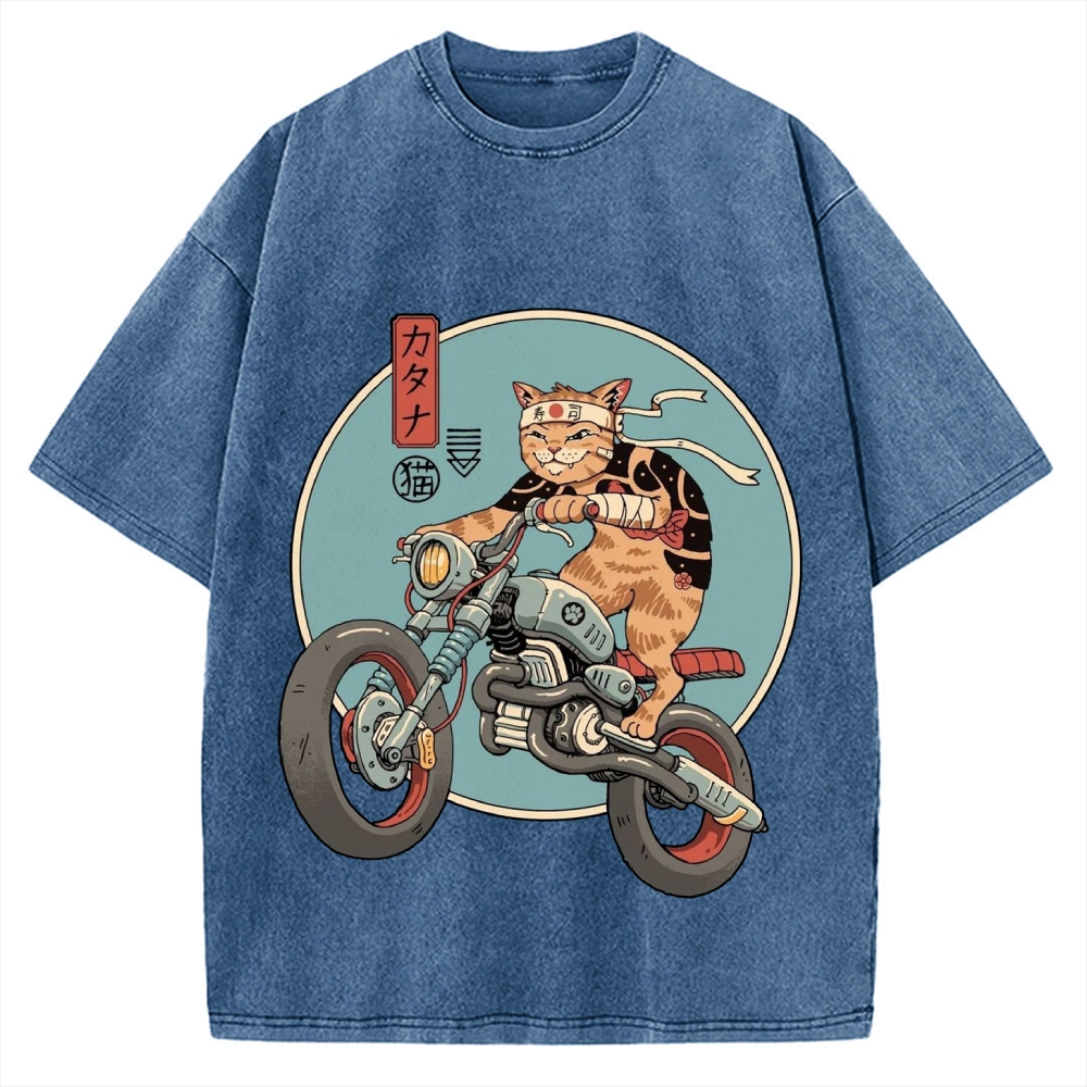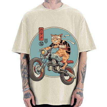 Japanese Cat riding a motorcycle Vintage Washed T-shirt