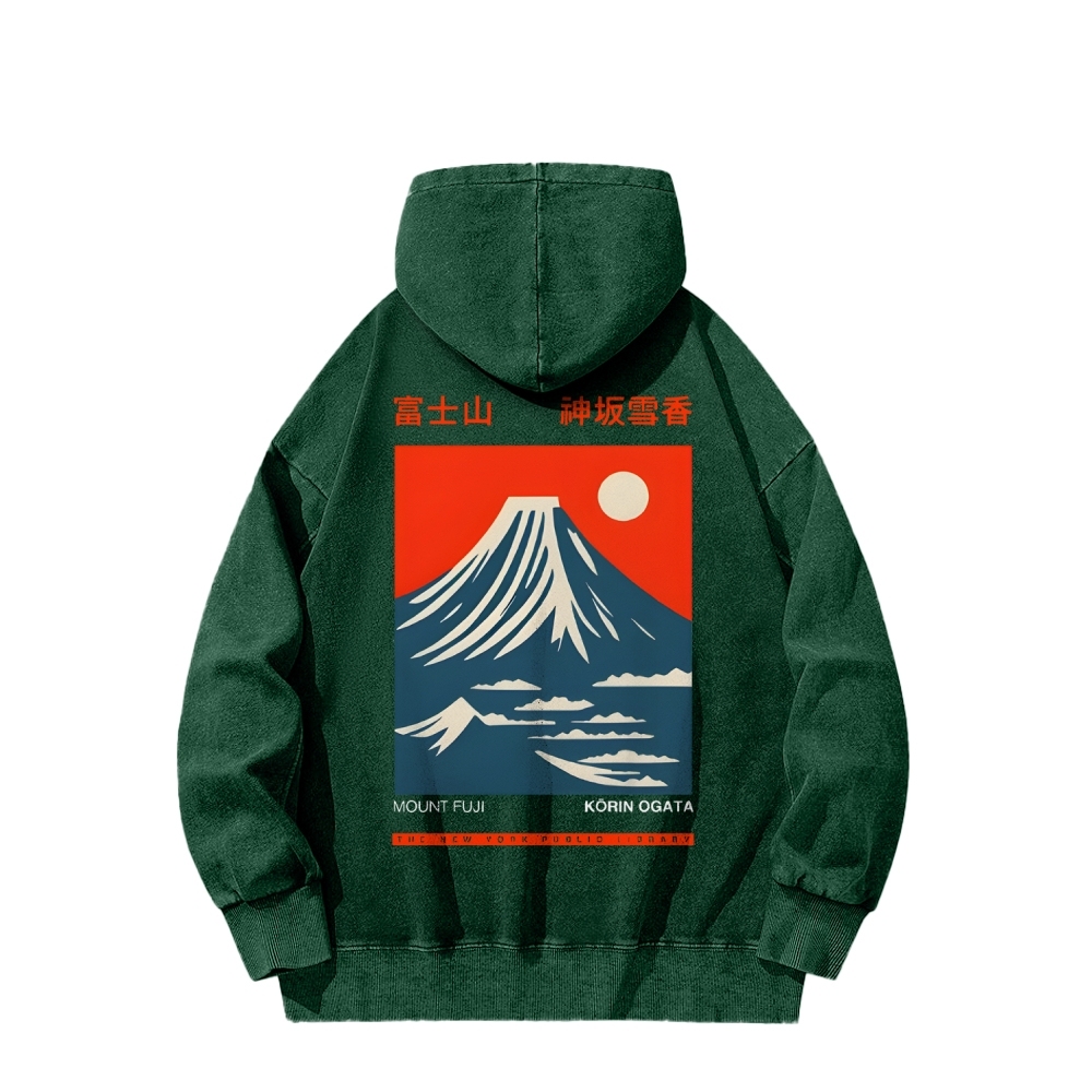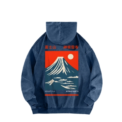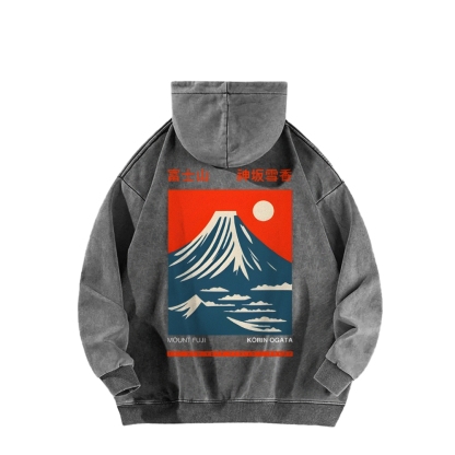 Mount Fuji Front And Back Printing Vintage Washed Hoodie