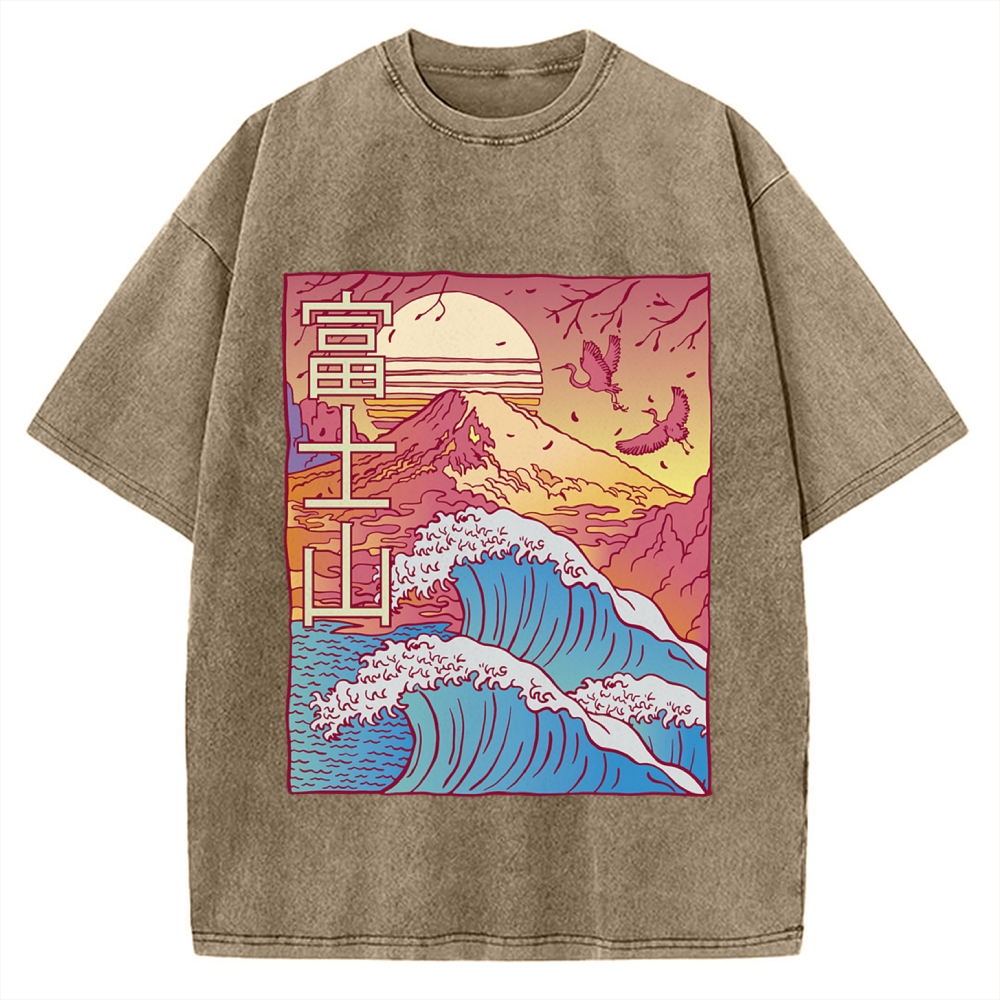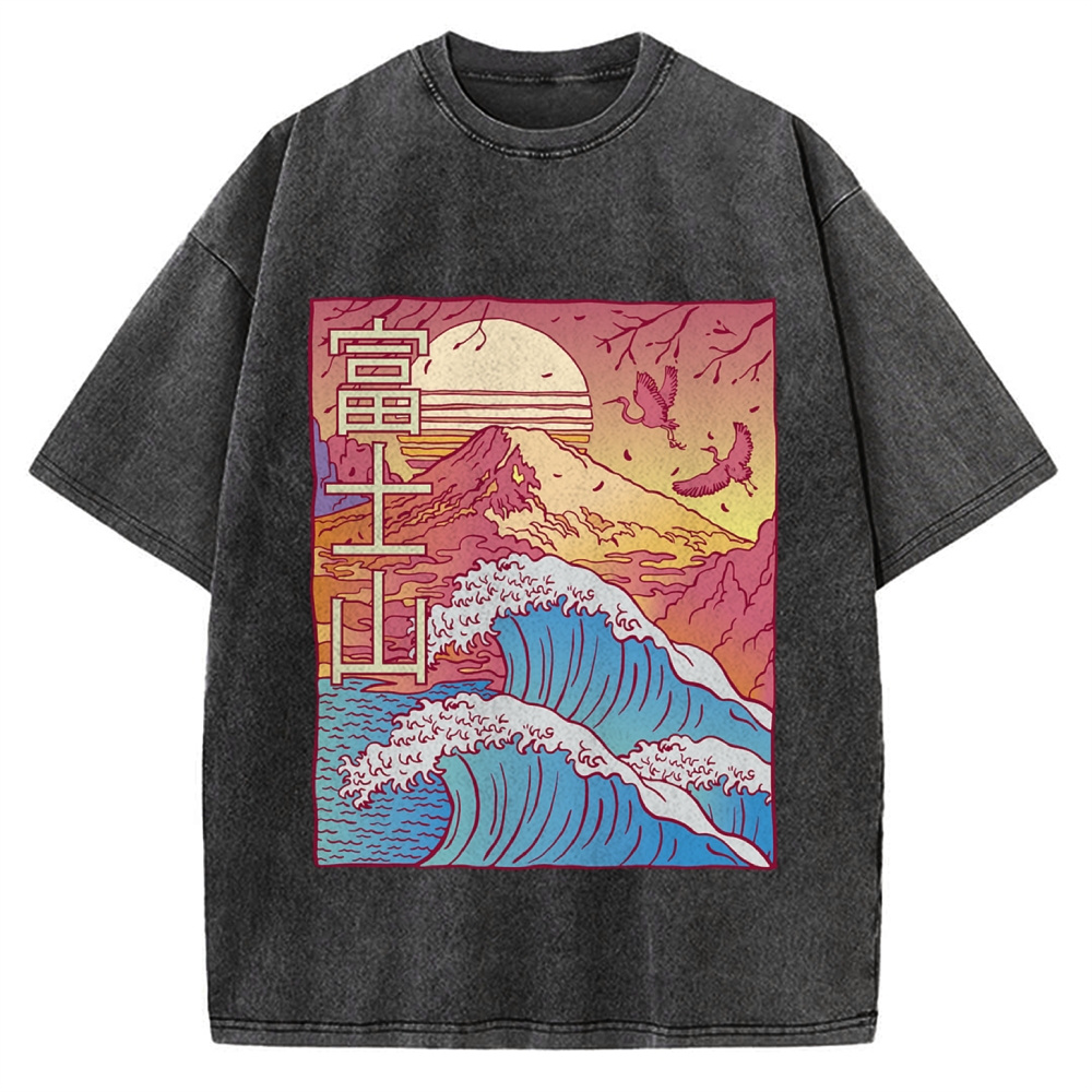Mount Fuji With Kanagawa Waves Front and Two Crane Flying Vintage Washed T-shirt