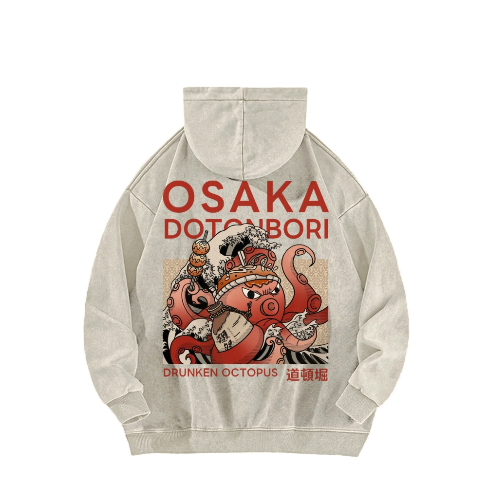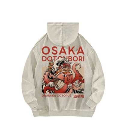 Osaka Dotonbori Drunken Octopus Front And Back Printing Vintage Washed Hoodie