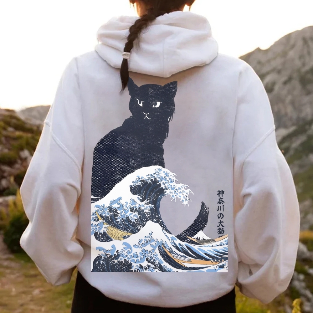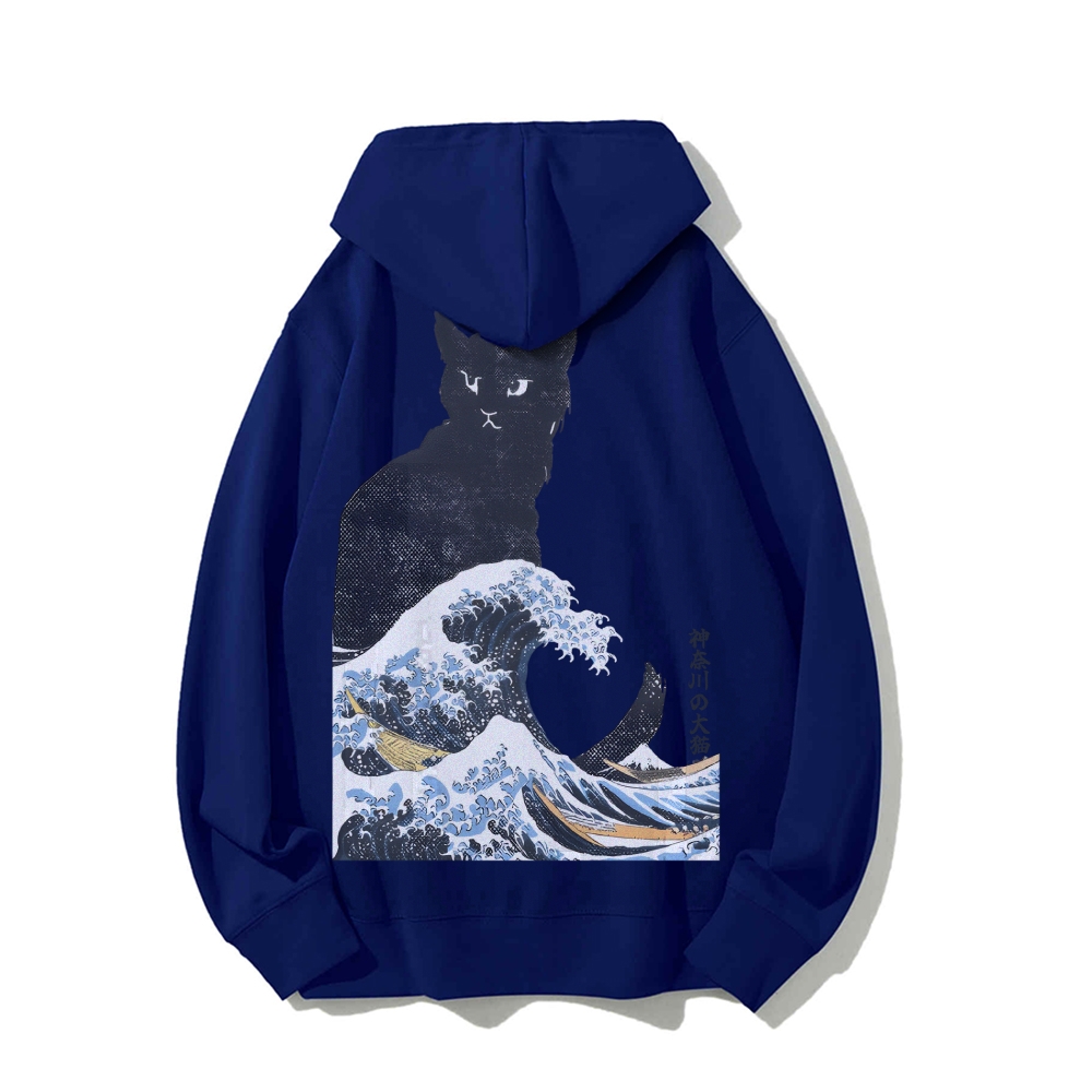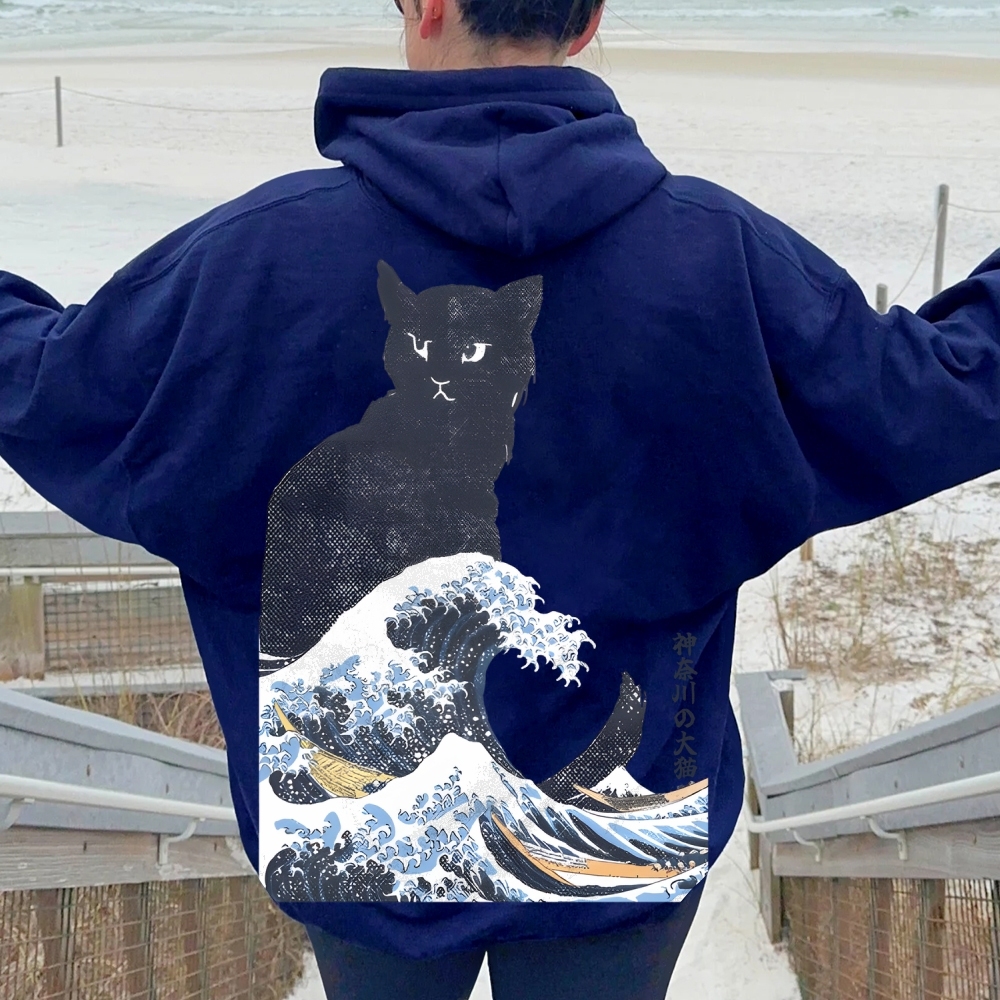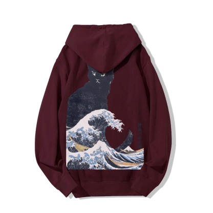 The Great Wave Off Cat Printed Back Cotton Hoodie