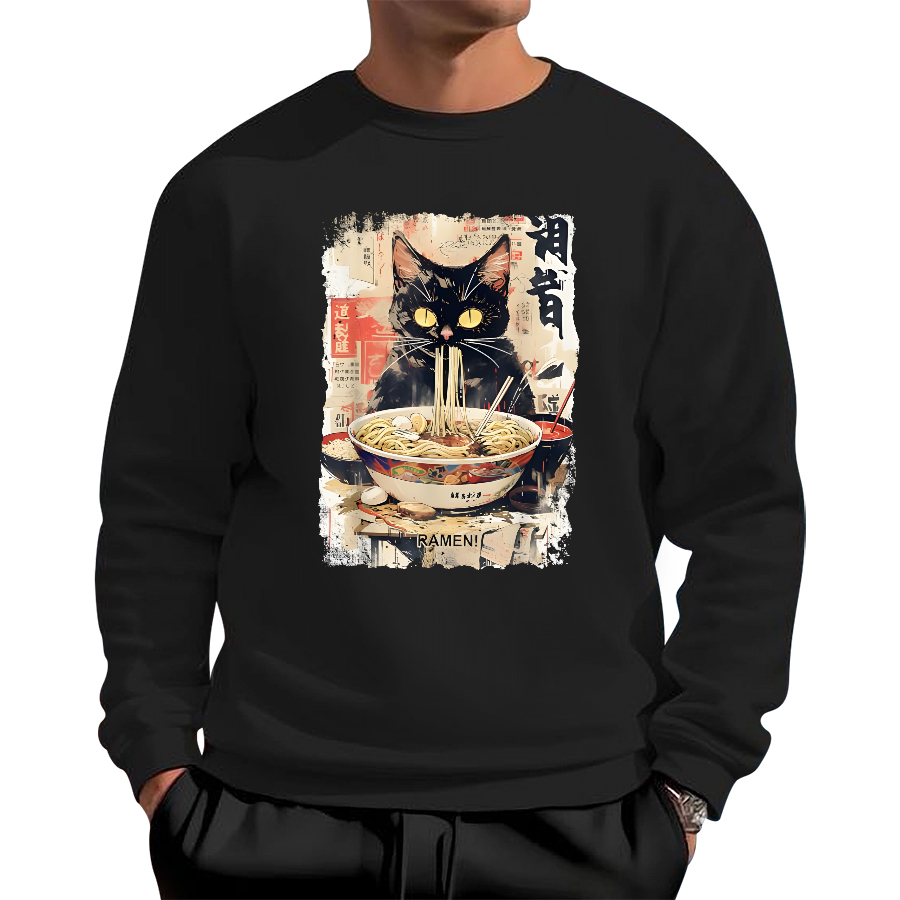 The retro style black cat likes to eat Lamian Noodles Cotton Pullover Sweatshirt