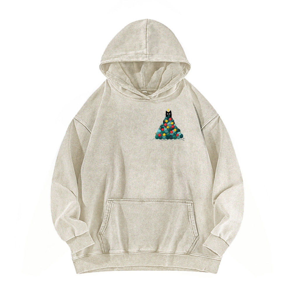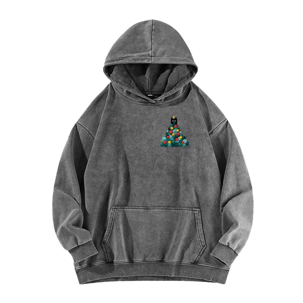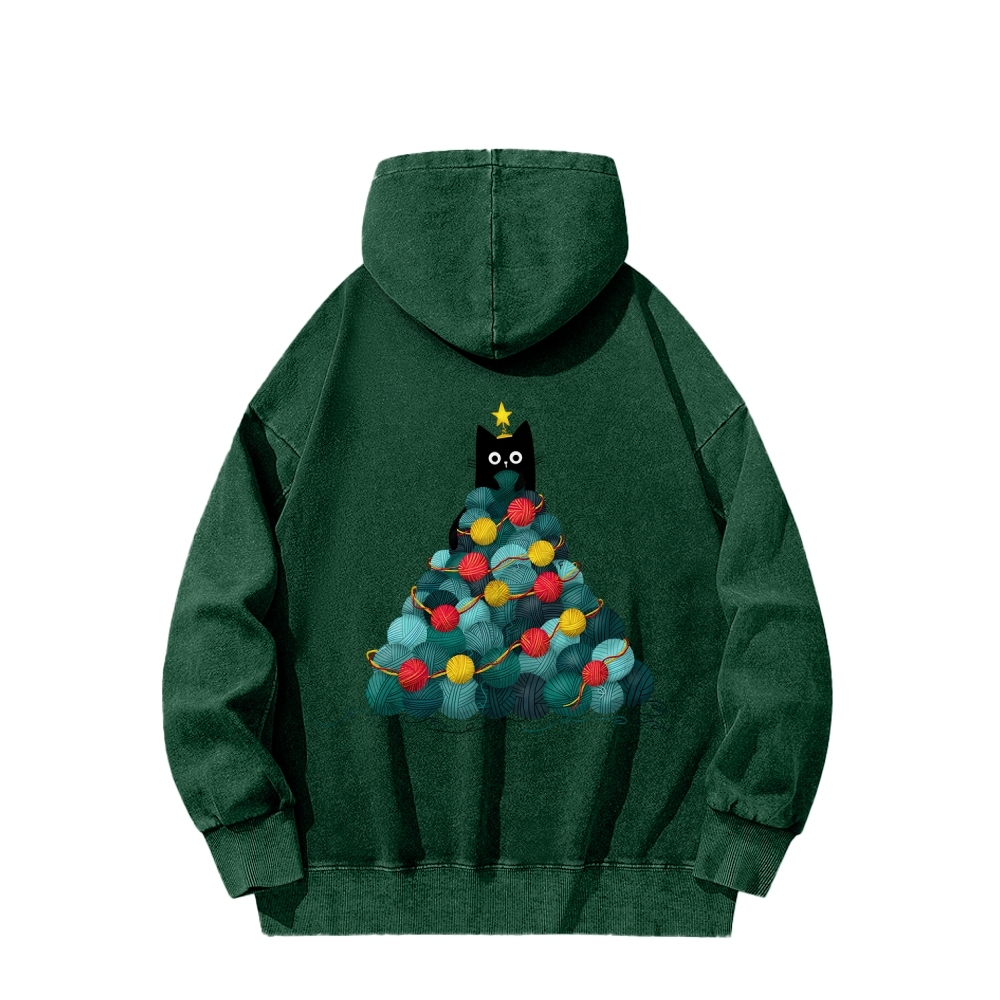 Yarn Christmas Tree Cat Front And Back Printing Vintage Washed Hoodie