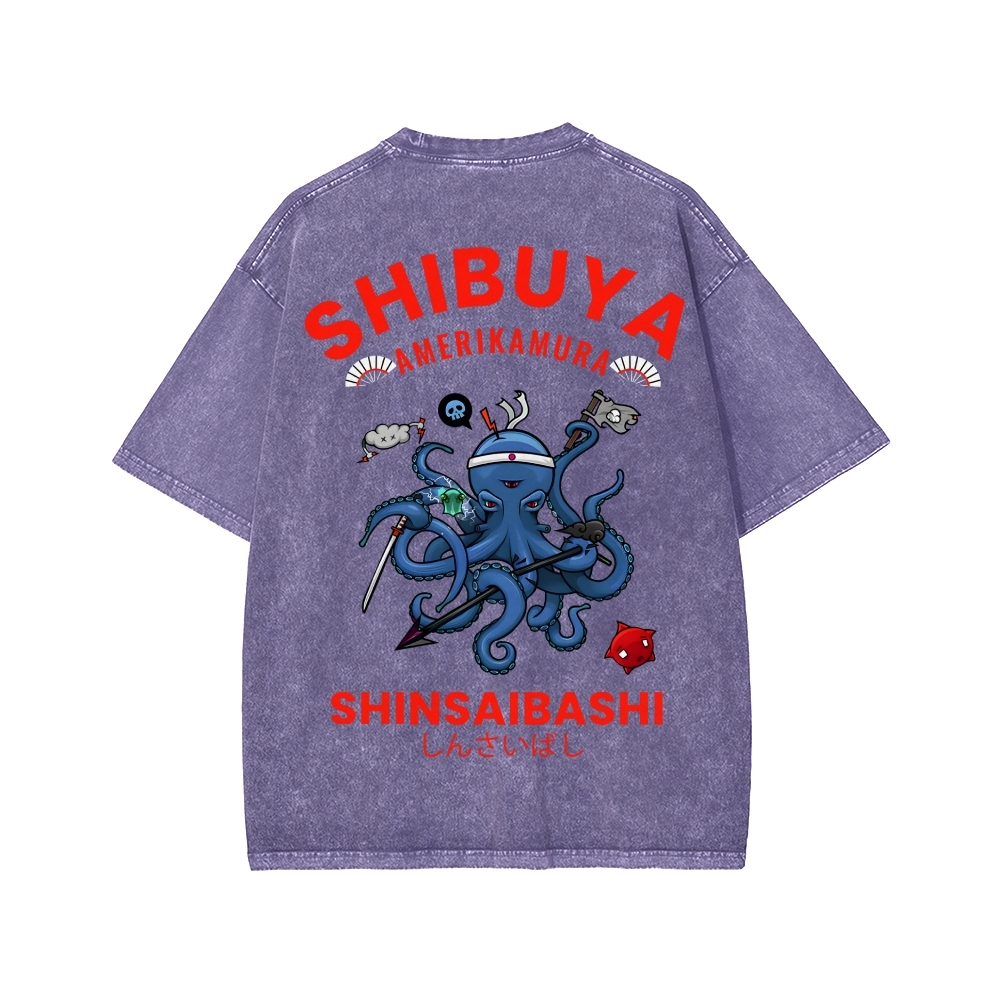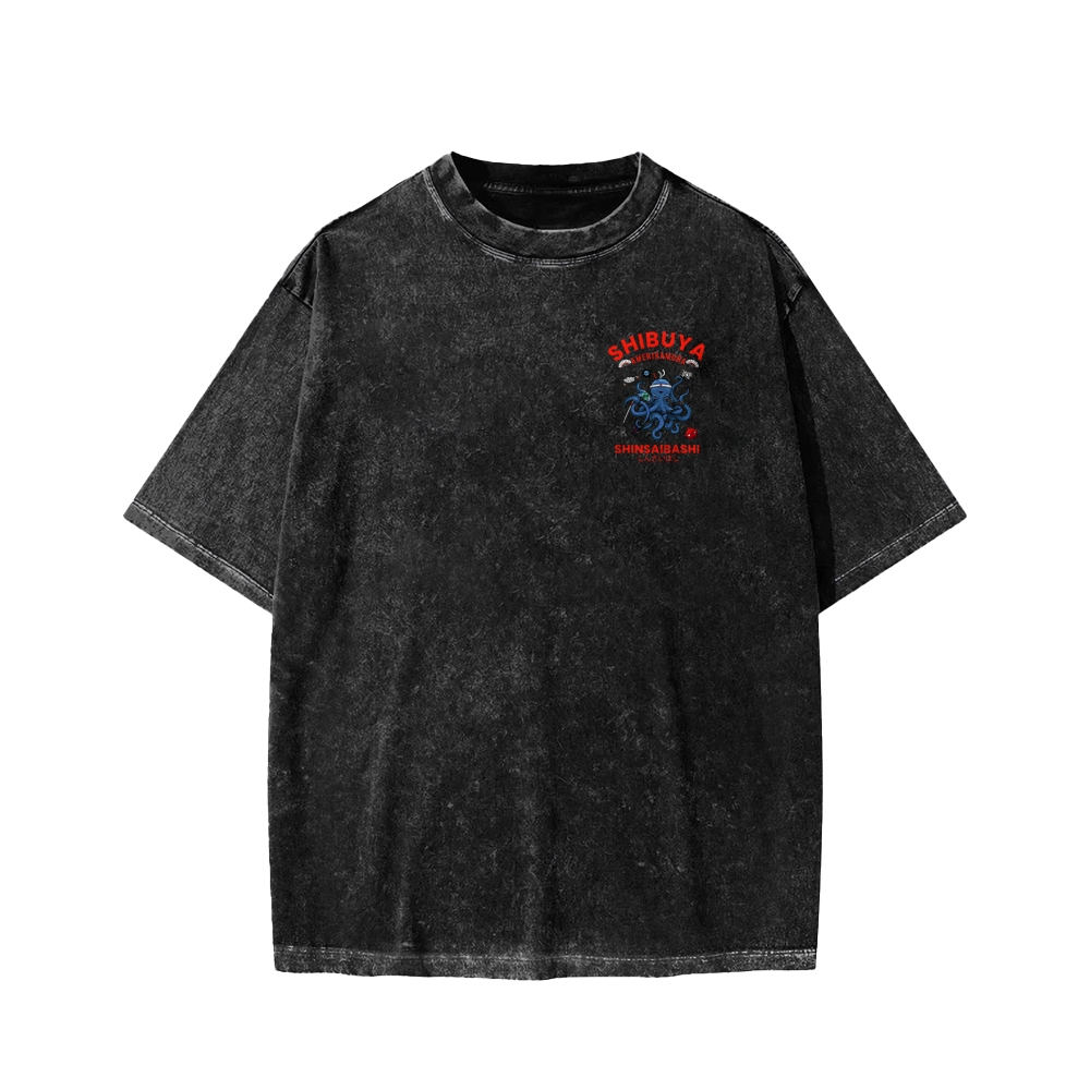 Shibuya Octopus Vintage Front And Back Printing Washed T-shirt