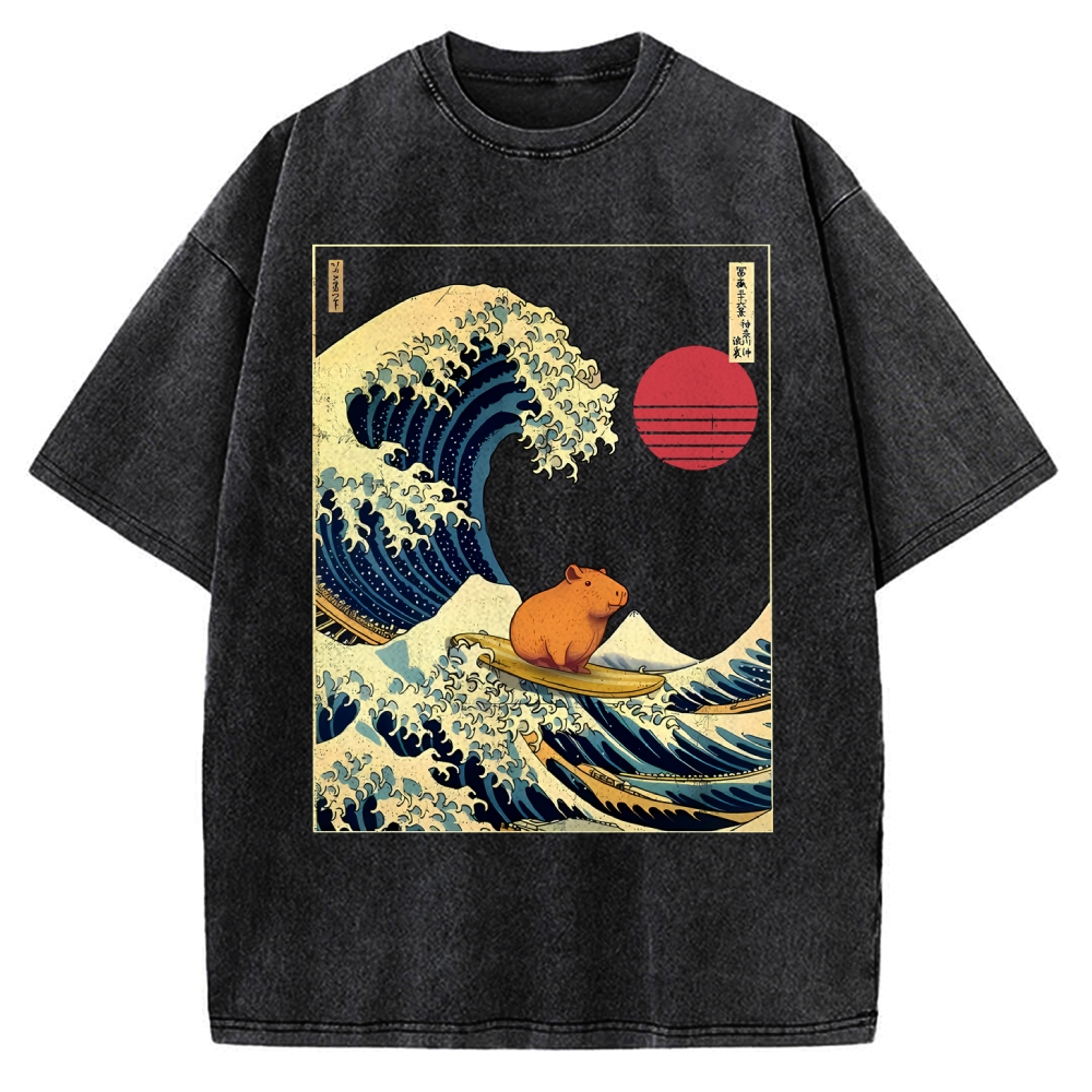 Capybara Kanagawa Japanese Surfing Wave Vintage Washed T-shirt