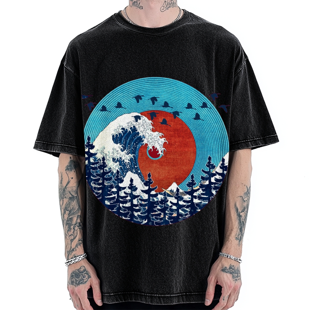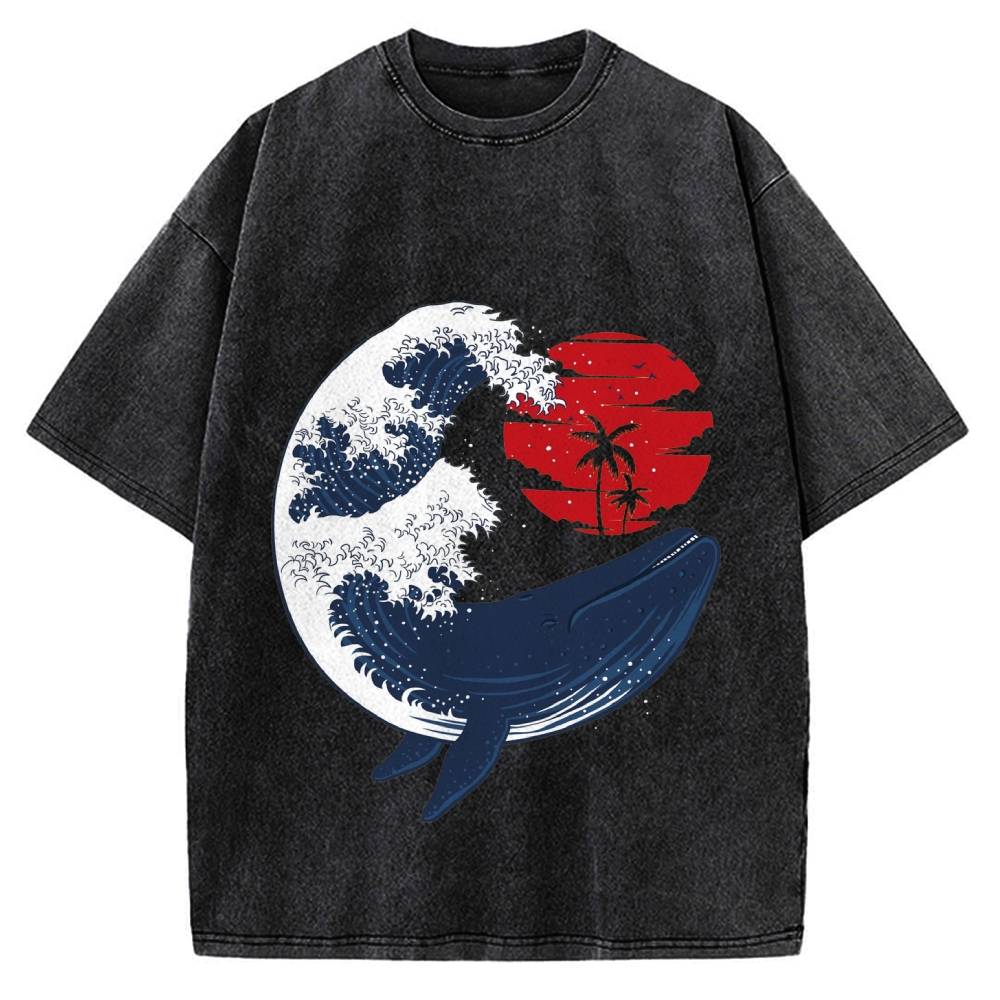 Whale Waves & Red Sun Japanese style Vintage Washed T-shirt