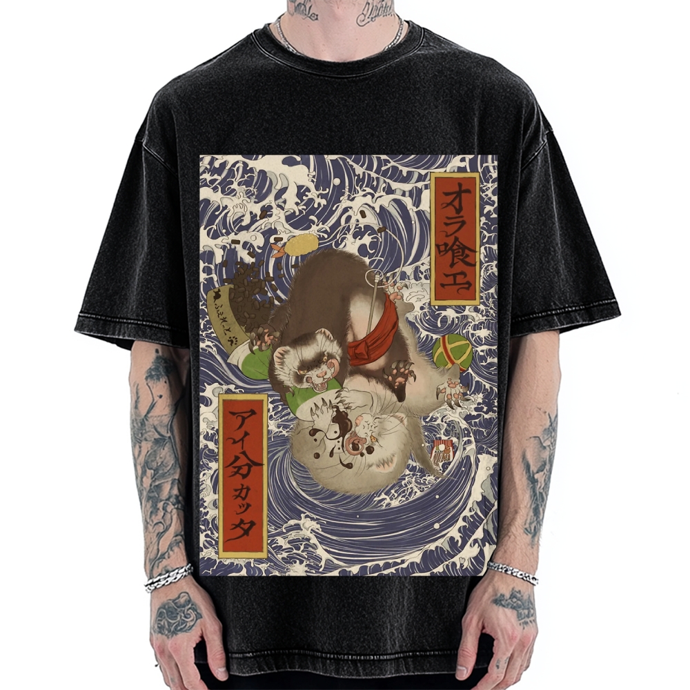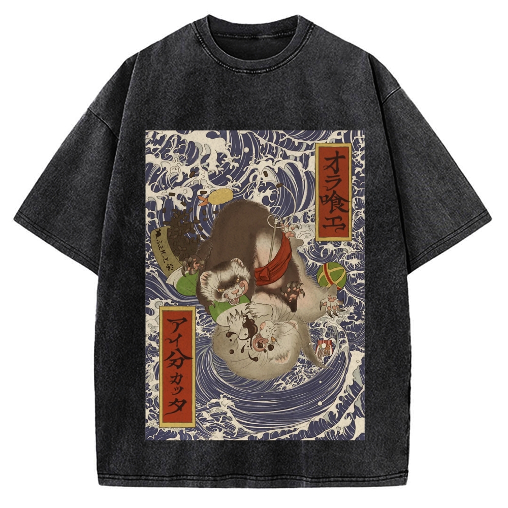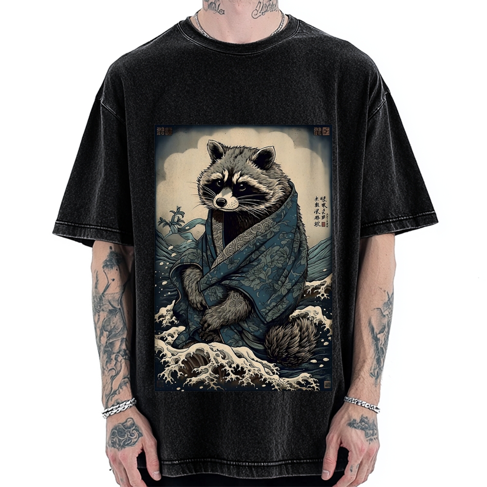 Raccoon and Waves - Traditional Japanese Ukiyoe Painting Vintage Washed T-shirt