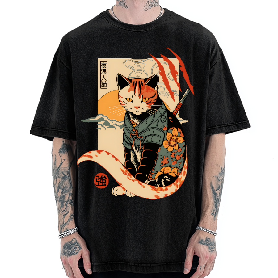 Black Cat Warrior Samurai Vintage Washed T-shirt