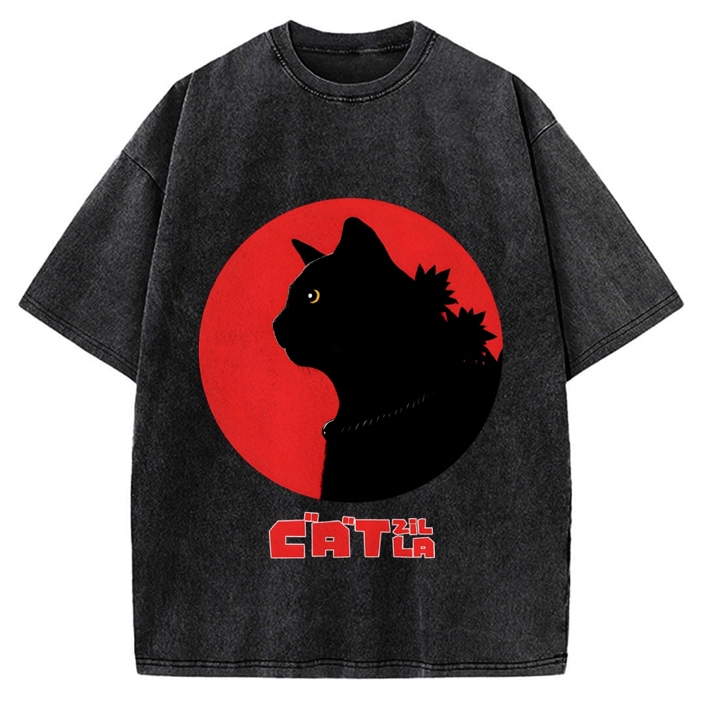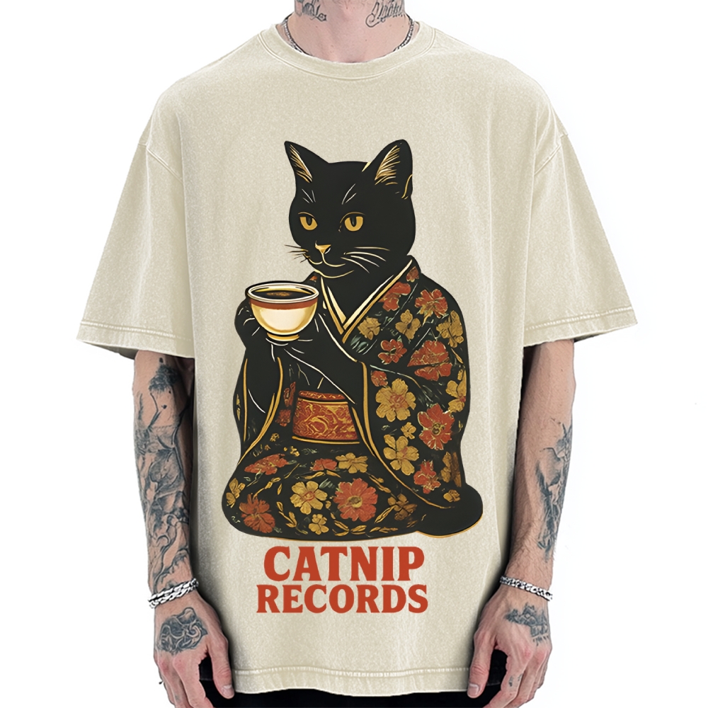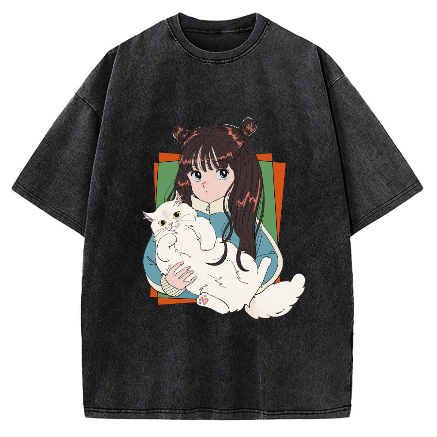 Printmaking style Japanese Anime Lucky Cat Vintage Washed T-shirt