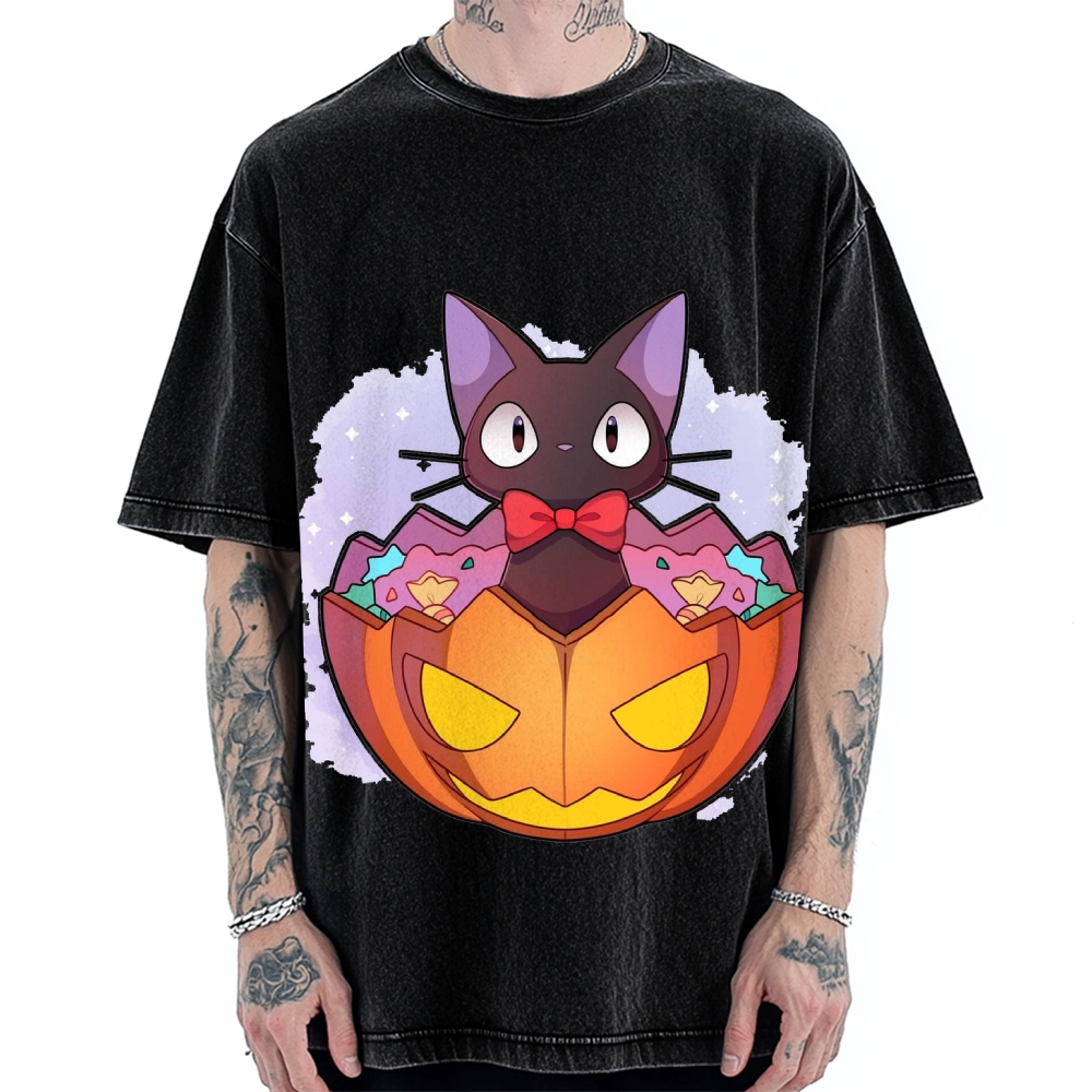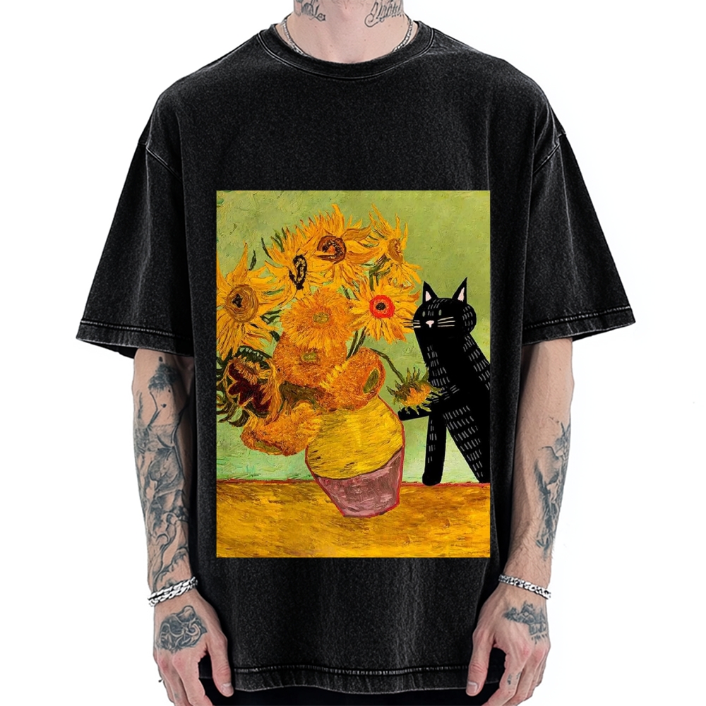 Christmas Black Cat Embroidery Vintage Washed T-shirt