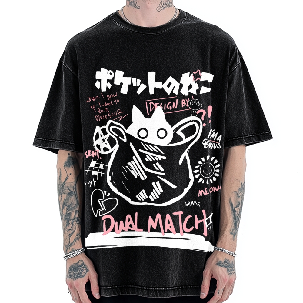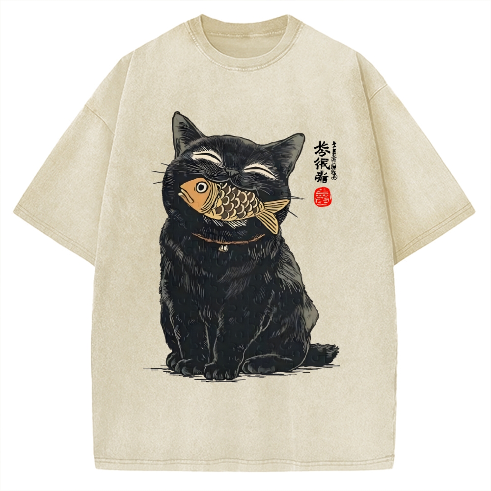 Japanese Black Cat Koi Fish Printed Vintage Washed T-shirt