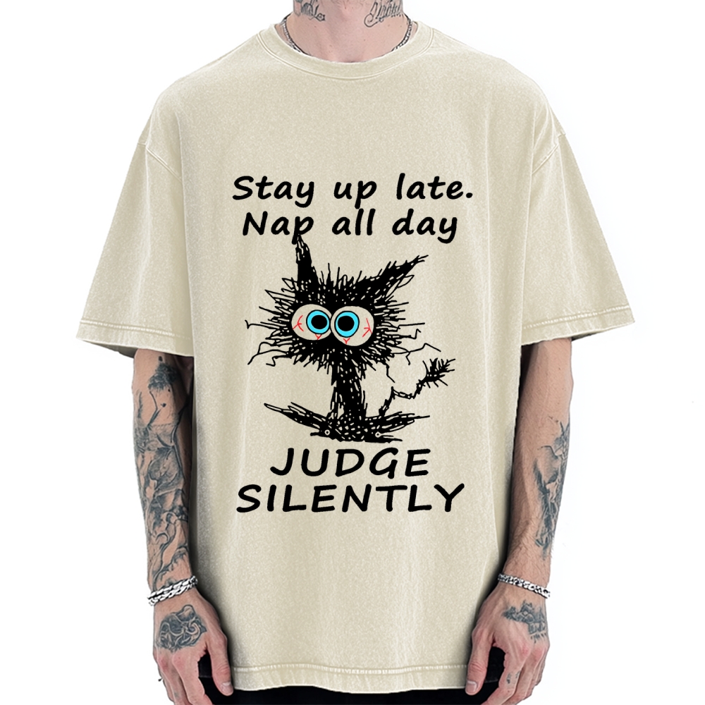 intage Cat Graffiti Printed Vintage Washed T-shirt