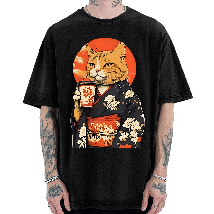 Cat Drinking Coffee Japan Vintage Washed T-shirt