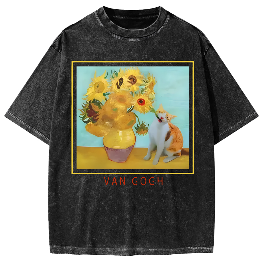 Naughty Cat Biting Sunflower Vintage Washed T-shirt