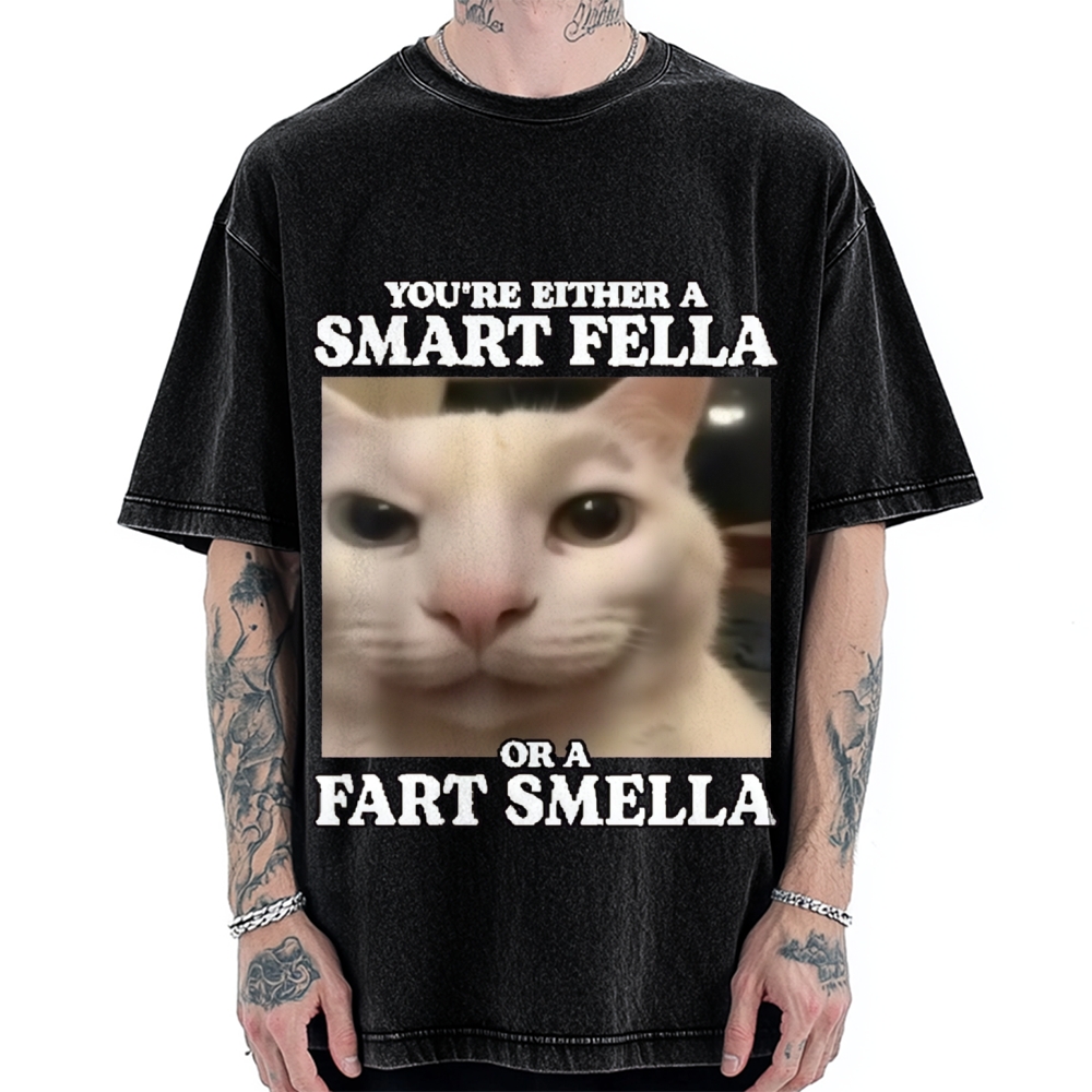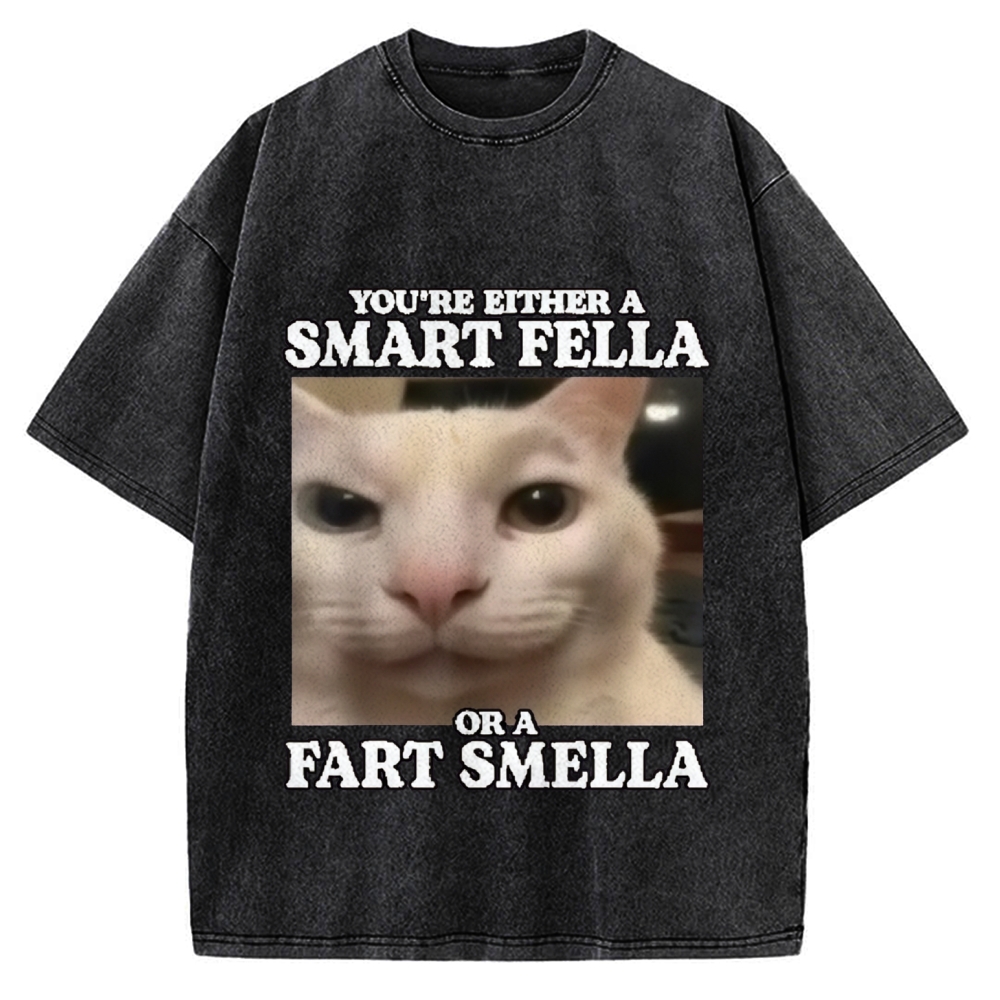 Smart Fella or Fart Smella Funny Meme Cat Vintage Washed T-shirt