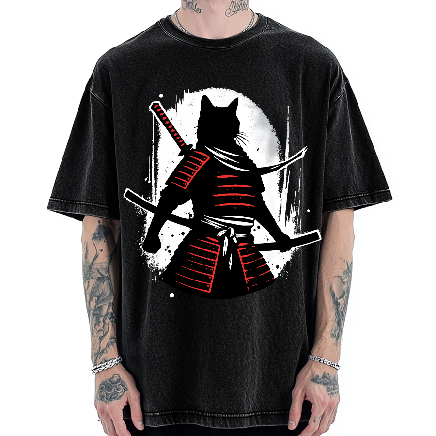 Black Cat Warrior Samurai Vintage Washed T-shirt