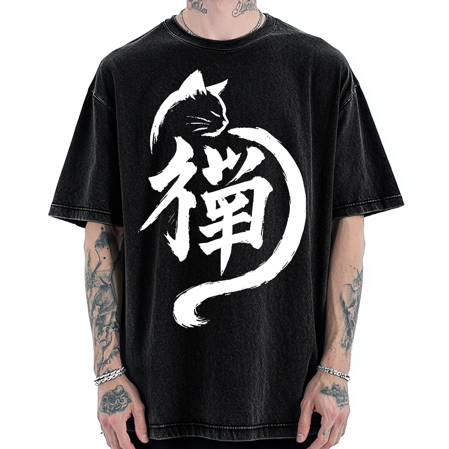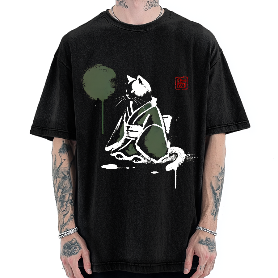 Geisha Cat Japanese Ink painting Vintage Washed T-shirt