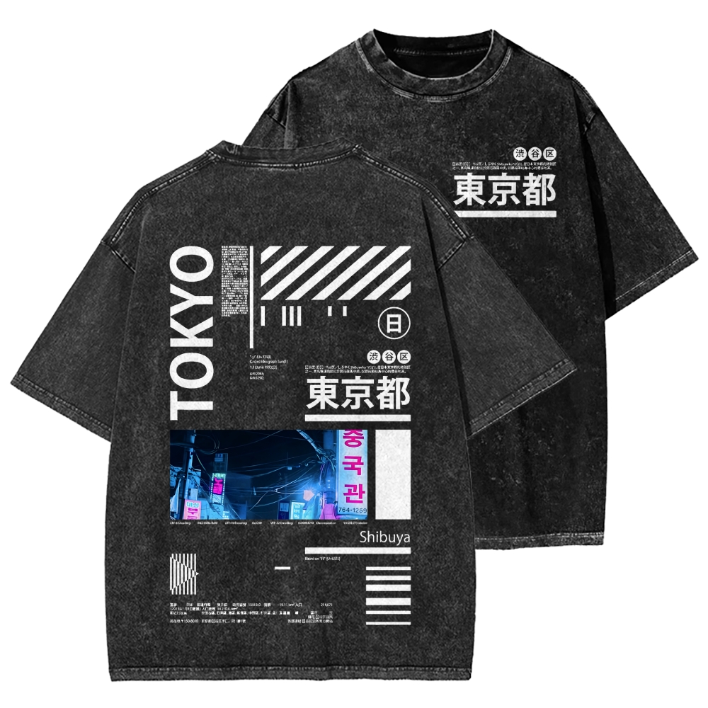 Night in Tokyo Street Front And Back Printing Washed T-shirt