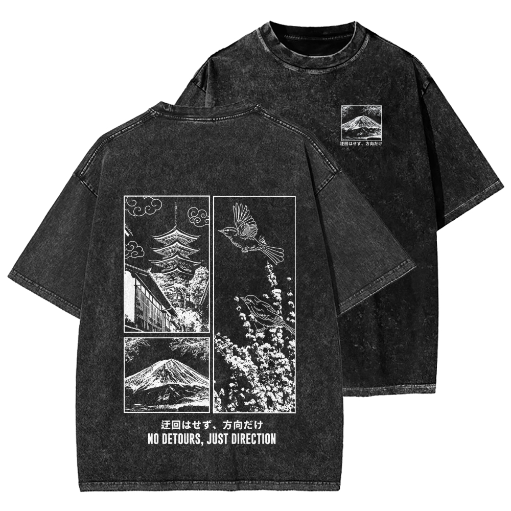 NO DETOURS JUST DIRECTION Japanese View Front And Back Printing Washed T-shirt