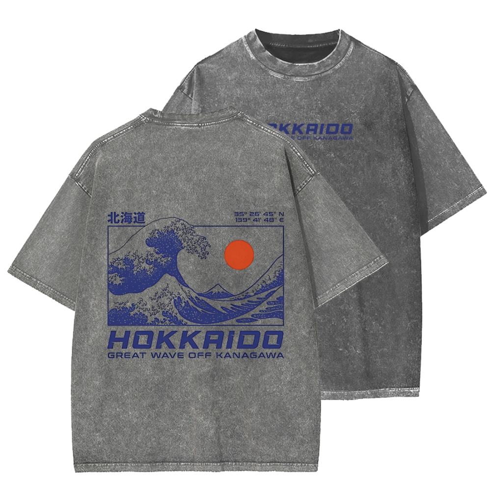 Hokkaido Wave Red Sun Front And Back Printing Washed T-shirt