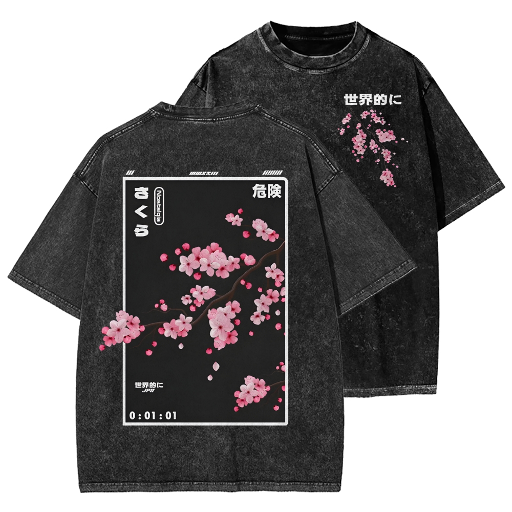 Cherry Blossom Front And Back Printing Washed T-shirt