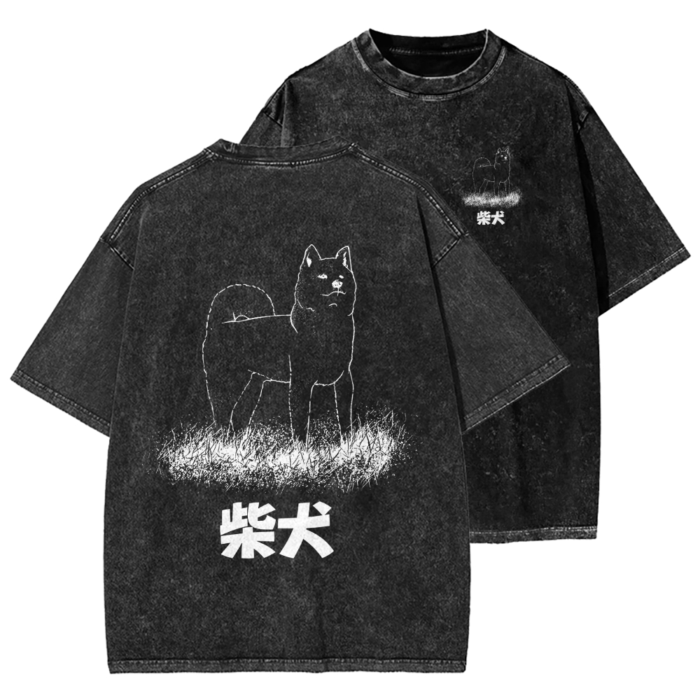Shiba Inu Dog Front And Back Printing Washed T-shirt