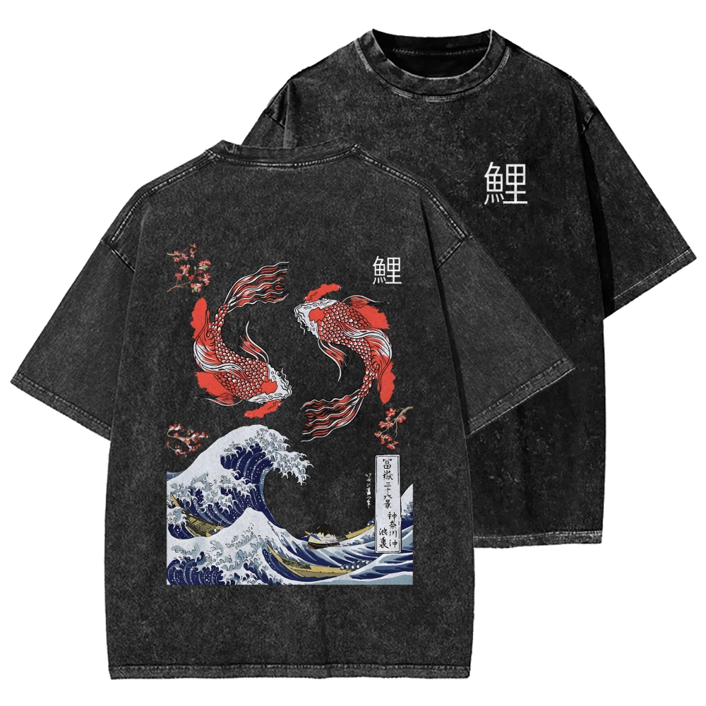 Yin Yang The Great Wave Off Koi Fish Japanese Art Front And Back Printing Washed T-shirt